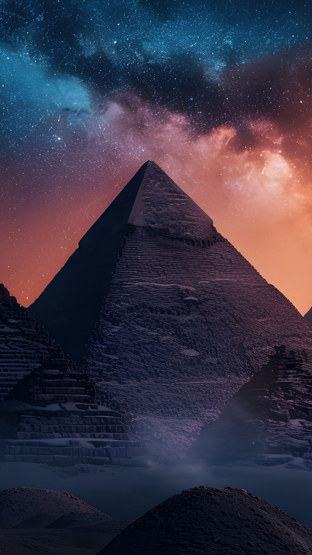 Giza's pyramids rise against a dramatic night sky blending deep indigo, teal, and fiery orange from what looks like the Milky Way mixed with