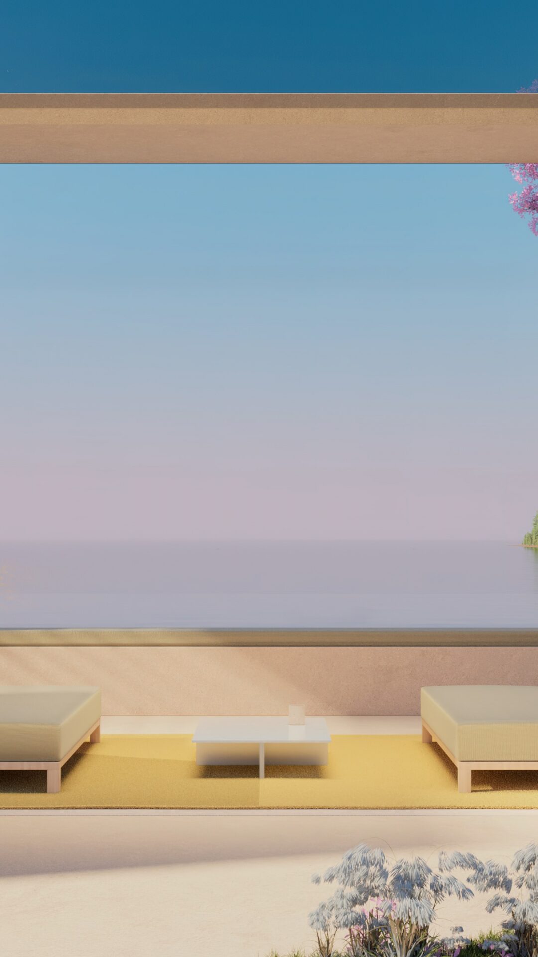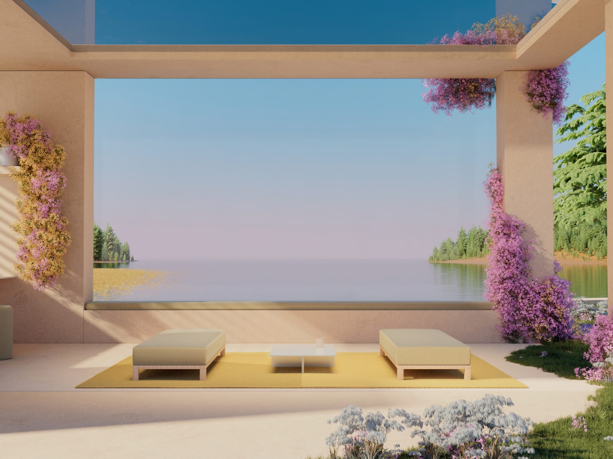 Modern open-air pavilion with sandy beige walls framing a dreamy lake view, pink bougainvillea climbing the pillars, and minimalist seating on a mustard yellow rug under soft golden light. For 4K monitors.