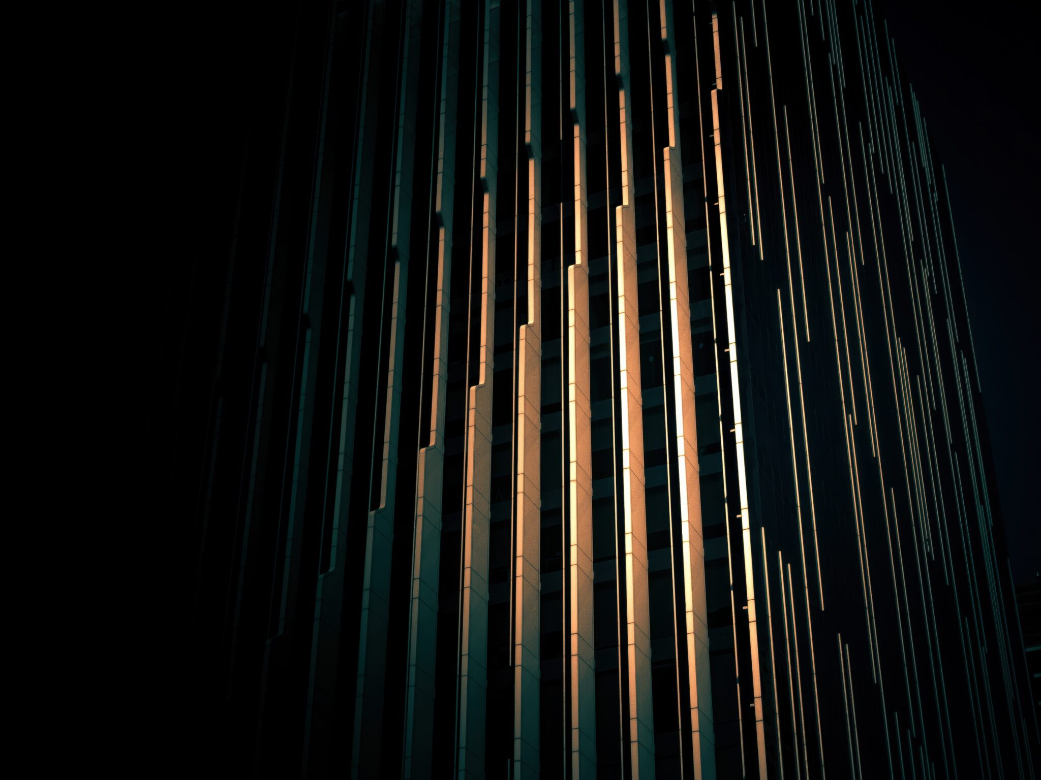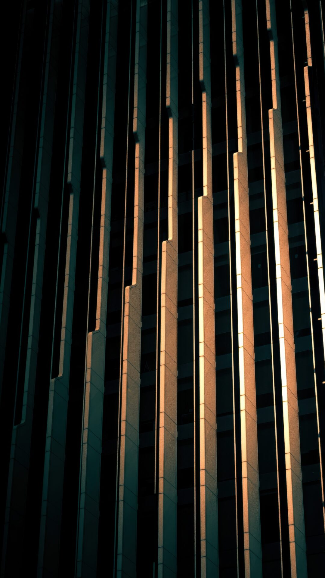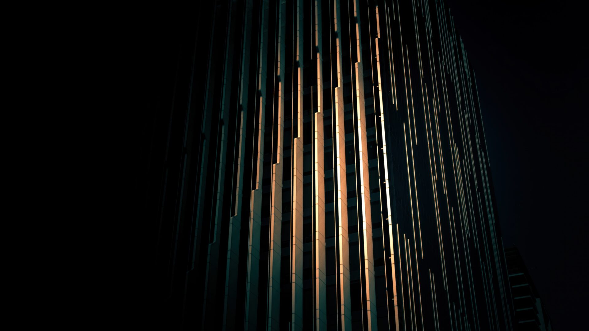Sleek glass tower catching warm golden light against a deep black night sky, with teal shadows adding some cool contrast along the vertical lines. For 4K monitors if you're into moody architecture shots.