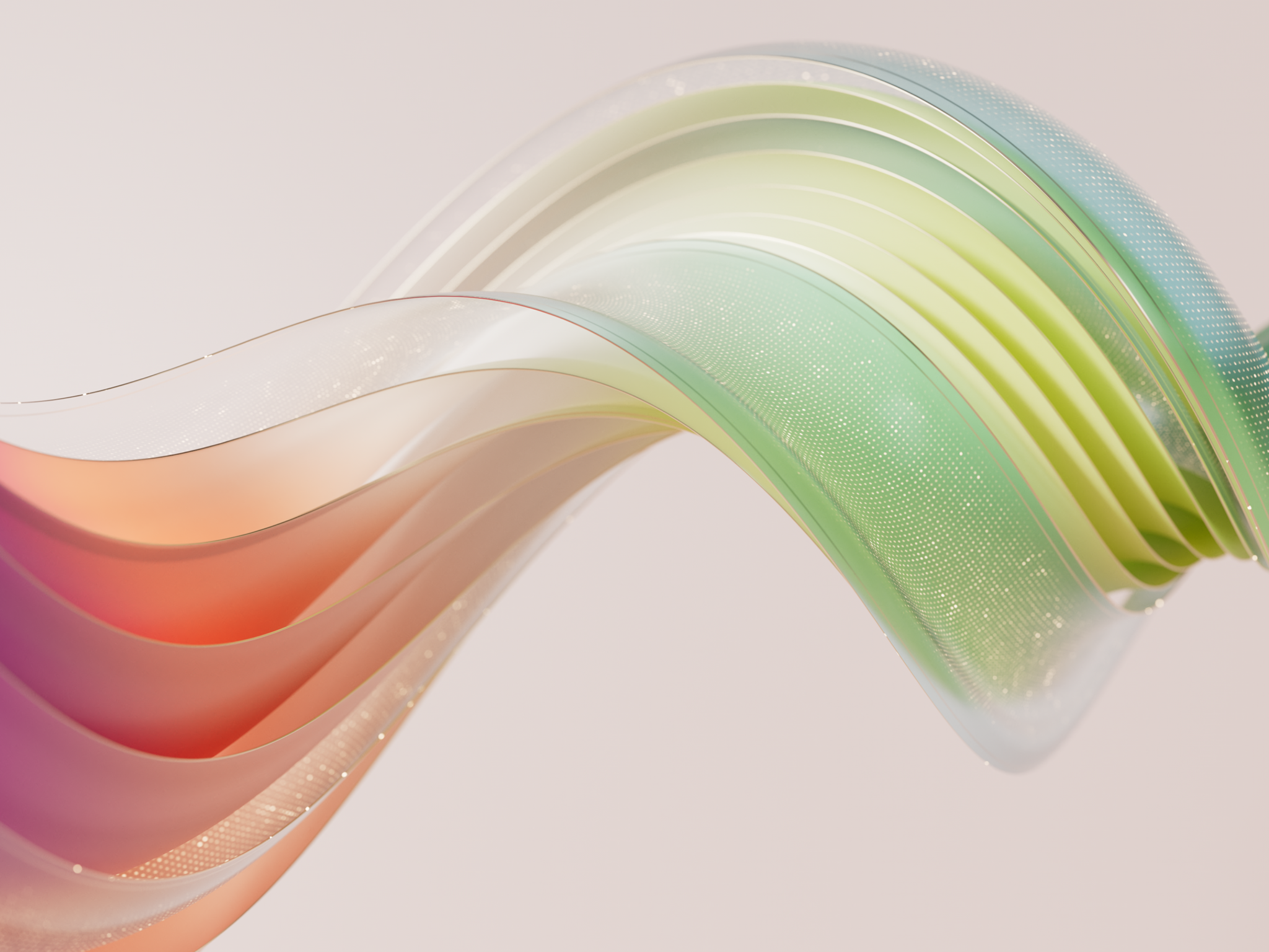 Flowing ribbons of purple, coral, soft green and teal glide across a pale background with a glittery translucent texture that feels smooth and dreamy. For 4K monitors, this abstract piece adds a calm touch of color to your desktop.