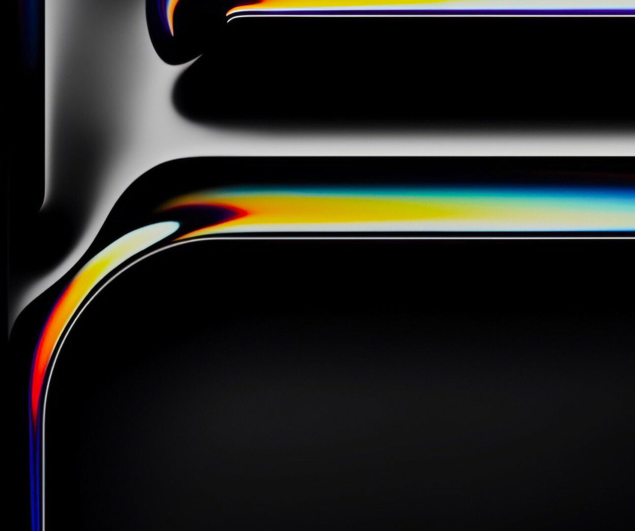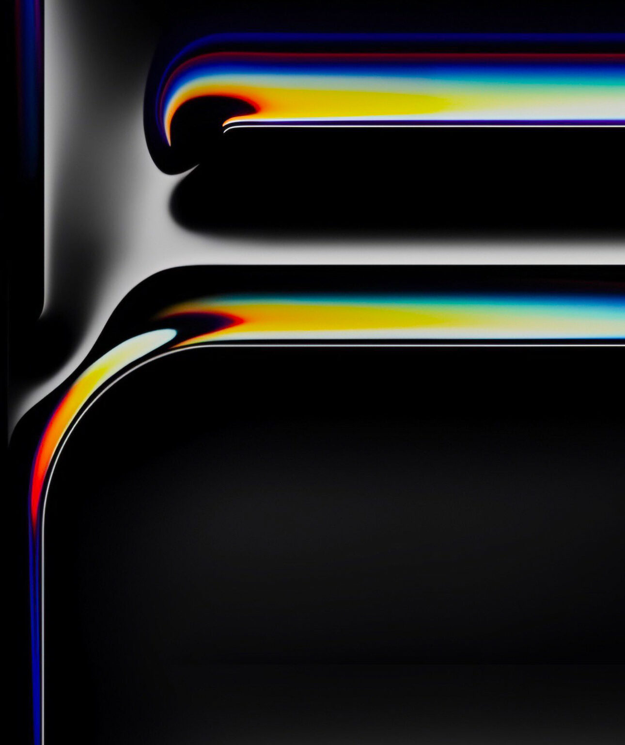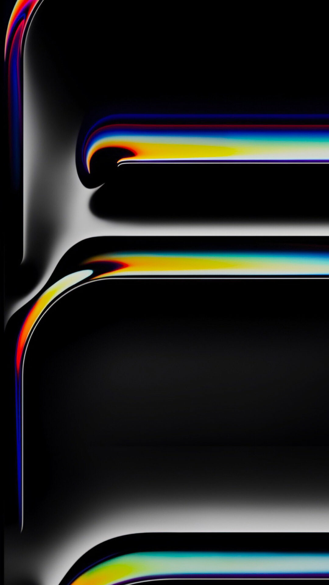 Stacked rectangular shapes fill the frame with a glossy black finish. Colorful gradients of blue, yellow, and red line the edges, creating a reflective surface.