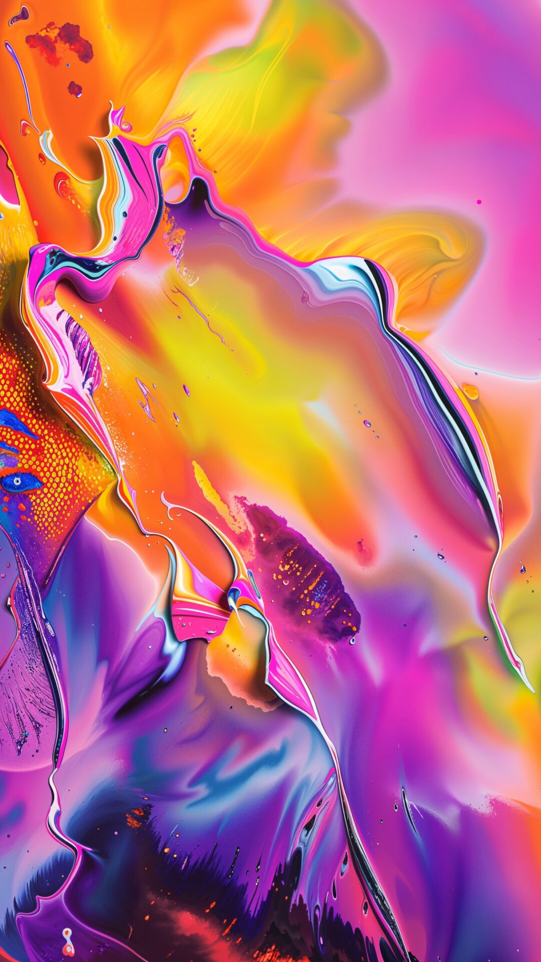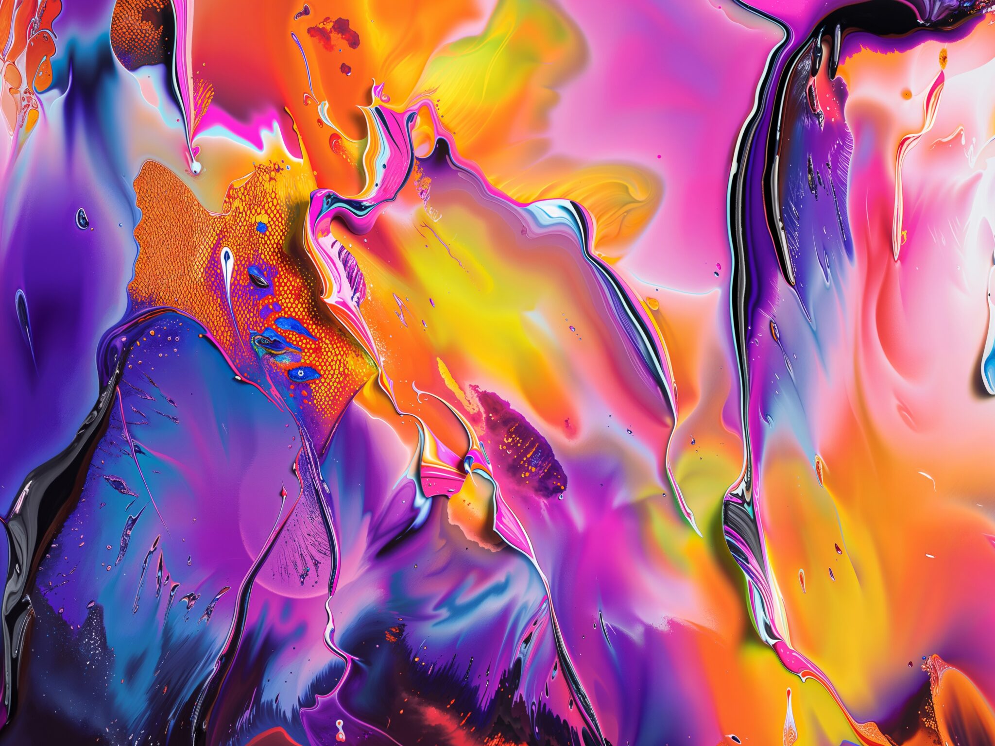 Vibrant fluid pour art with glossy swirls of purple, hot pink, orange, yellow and deep blue all blending together in that satisfying liquid way. For 4K monitors if you want something abstract and eye-catching on your desktop.