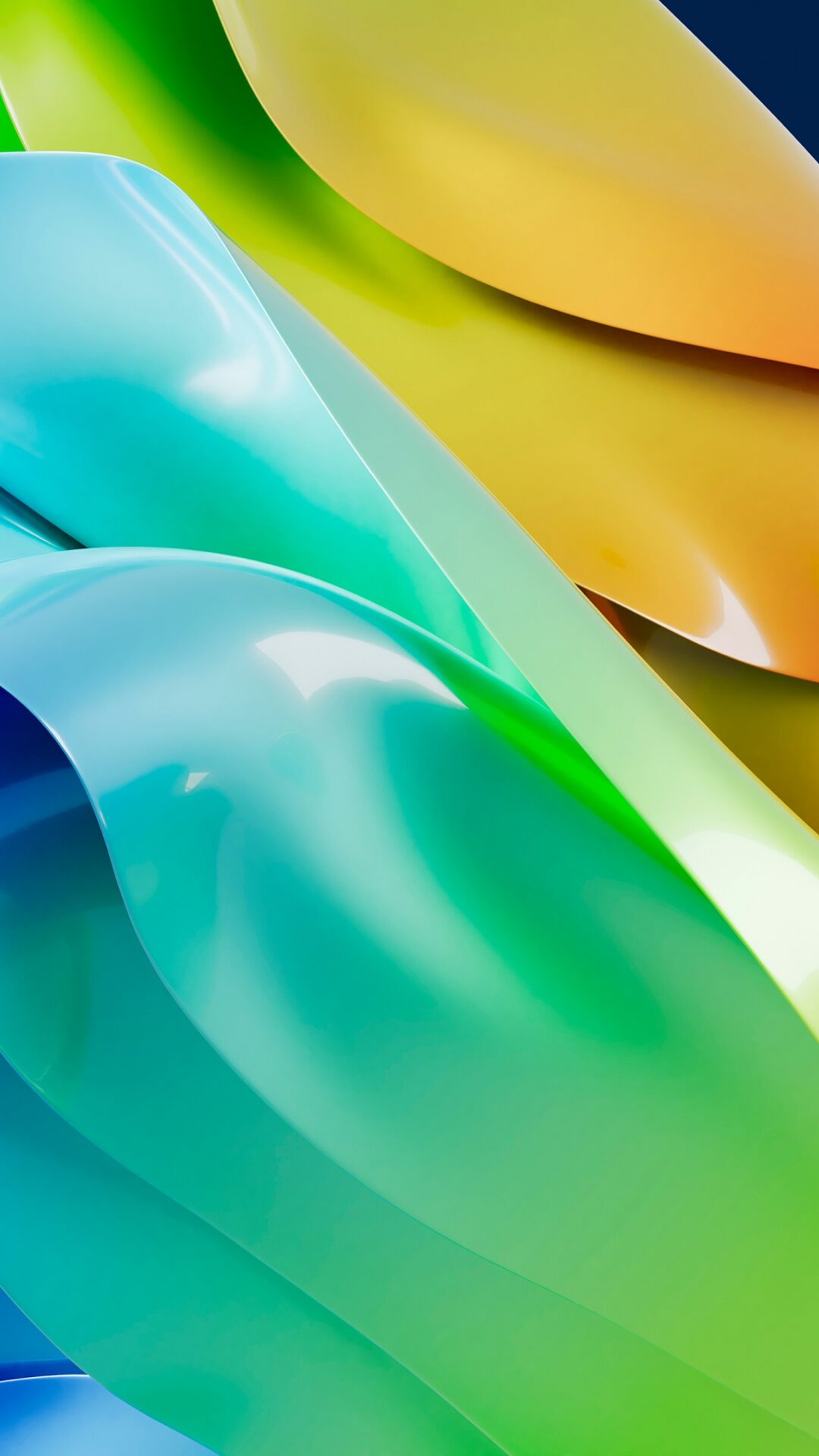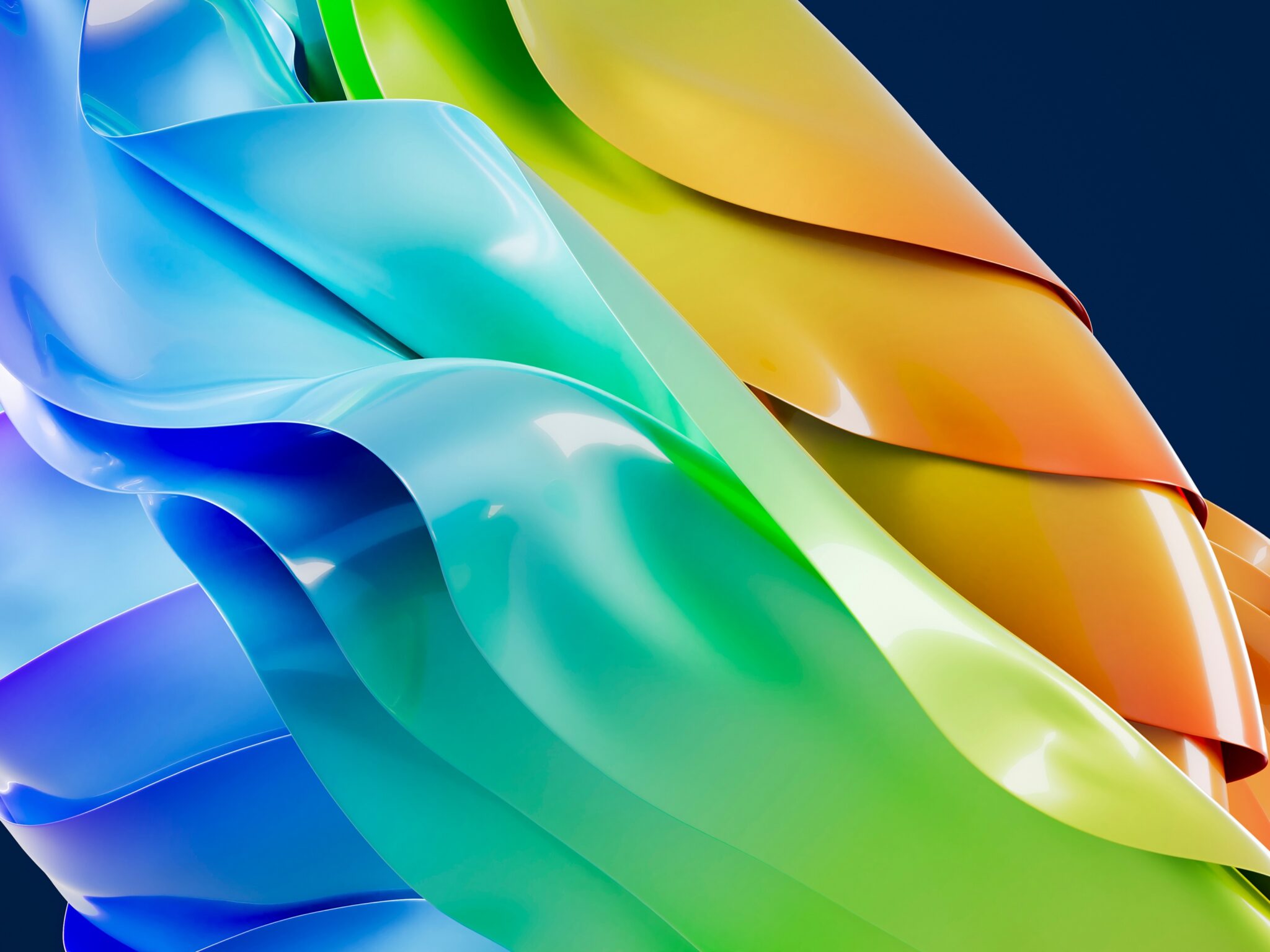 Glossy ribbon-like shapes twist and fold together in a smooth gradient flowing from deep blue through cyan, green, and into warm orange and …