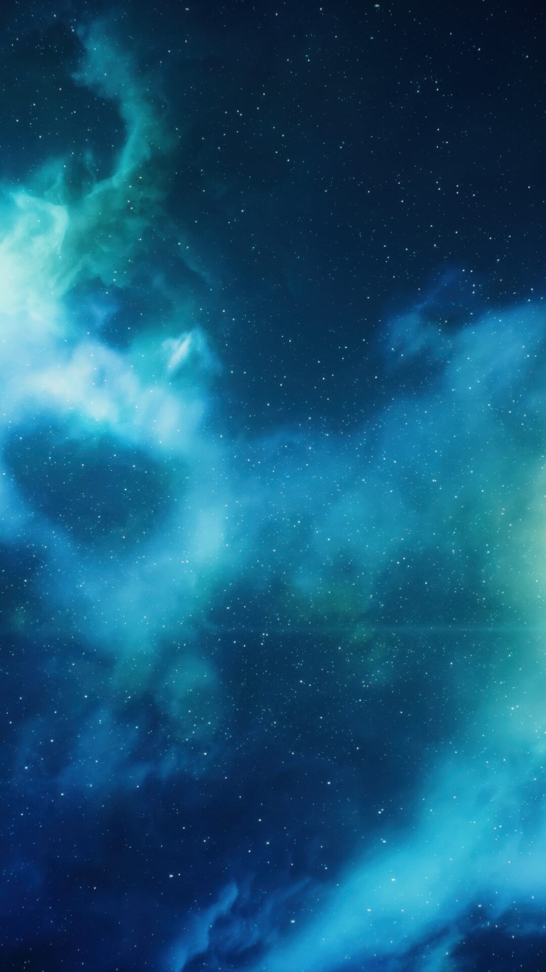 Brilliant cyan and turquoise nebula clouds swirl through dark space with scattered white stars creating an ethereal cosmic scene. Works beau