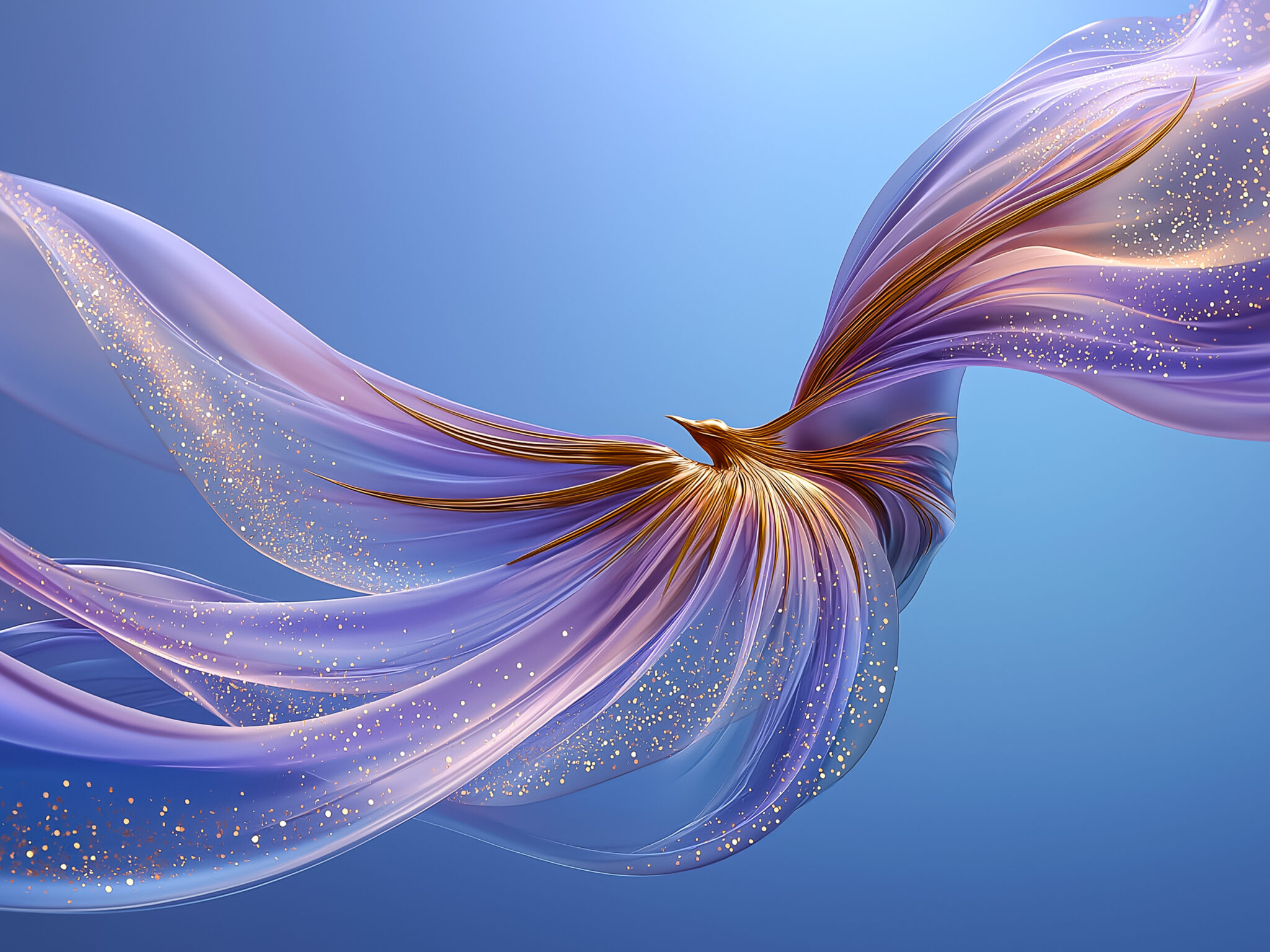 Flowing ribbons of soft lavender and violet silk twist together with golden threads at the center, scattered with glittery gold particles ag