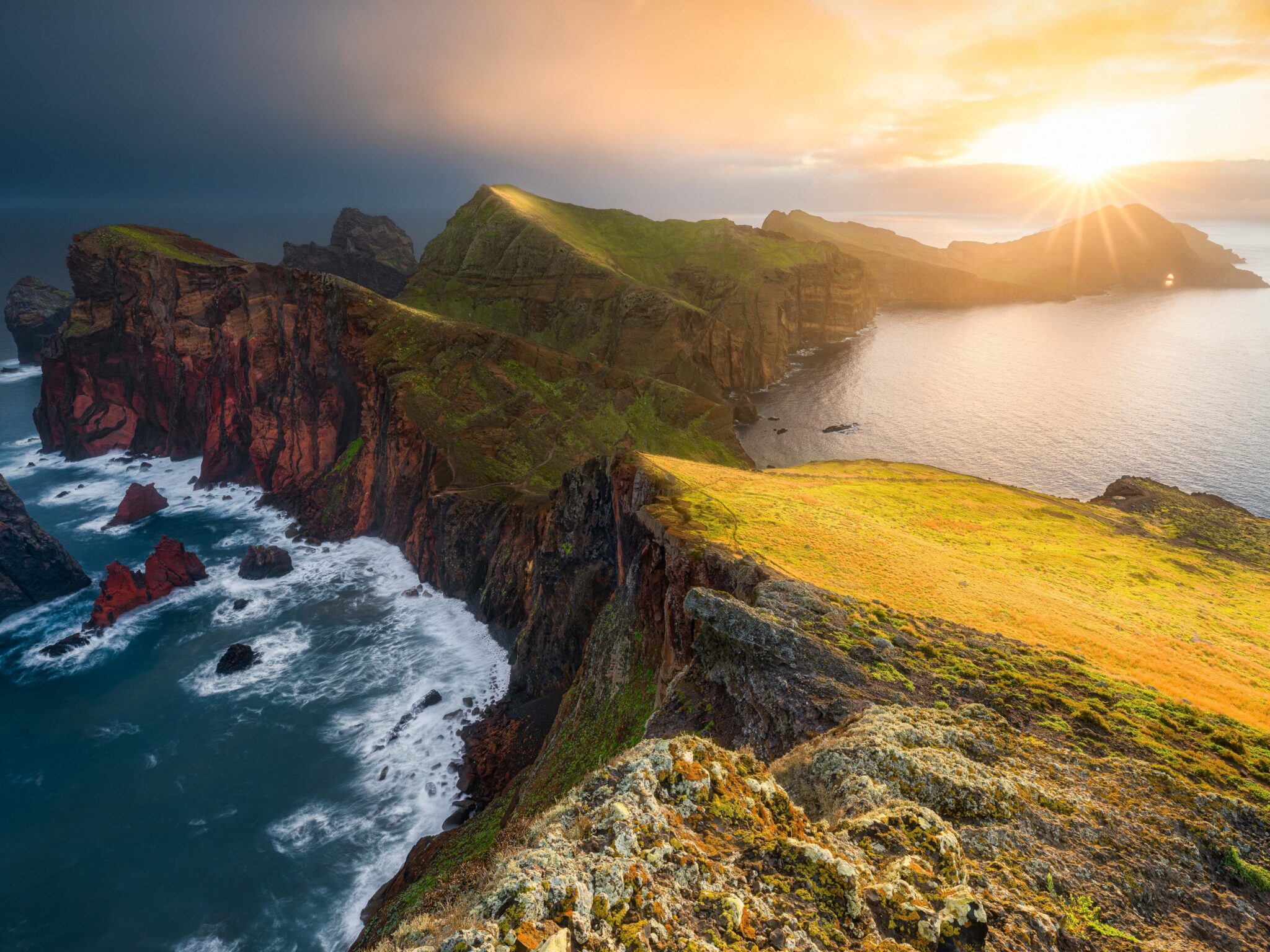 Dramatic coastal cliffs with vibrant green grass and reddish rock faces catch golden sunlight while waves crash against the rugged shoreline
