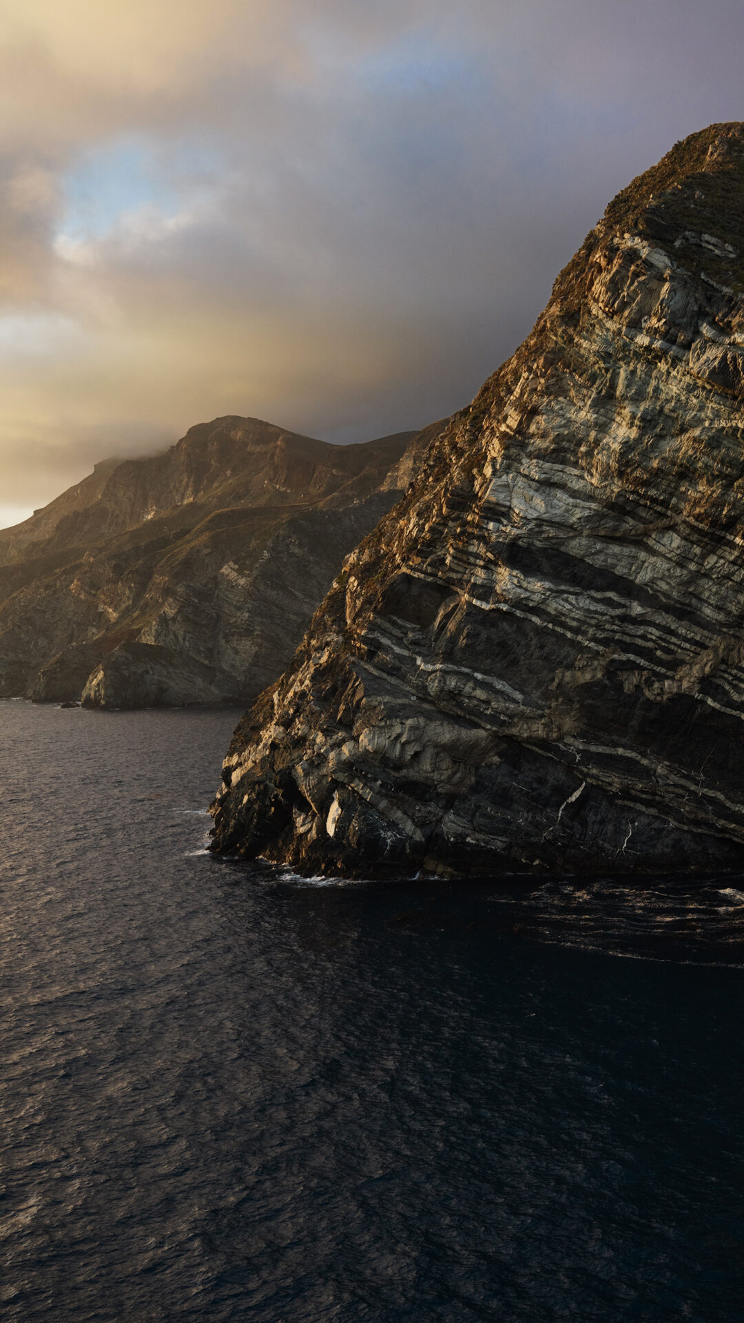 A rocky coastline meets dark water under a cloudy sky, forming a steep incline. The light reflects off the rock face, revealing layered textures and a warm yellow hue.