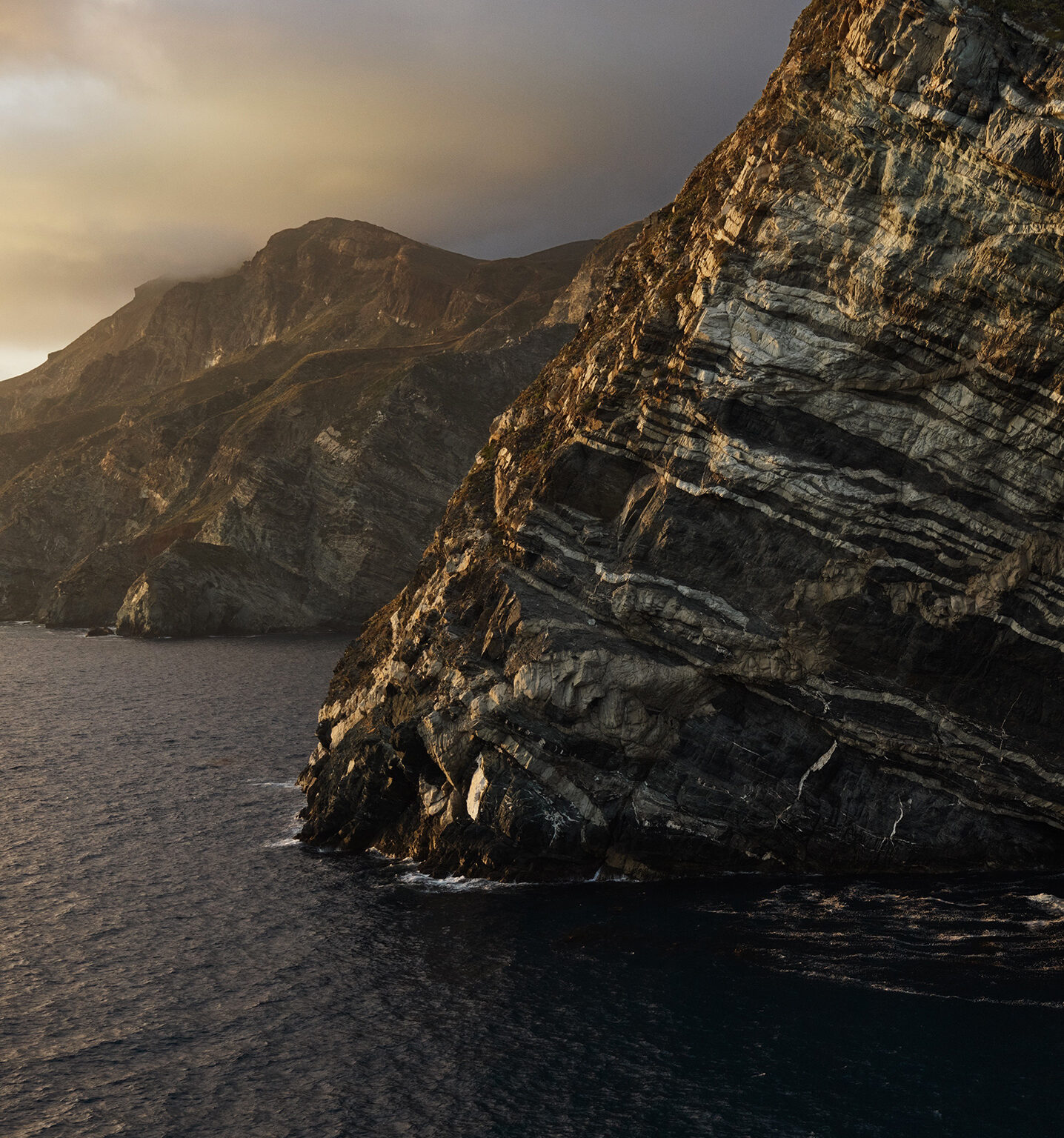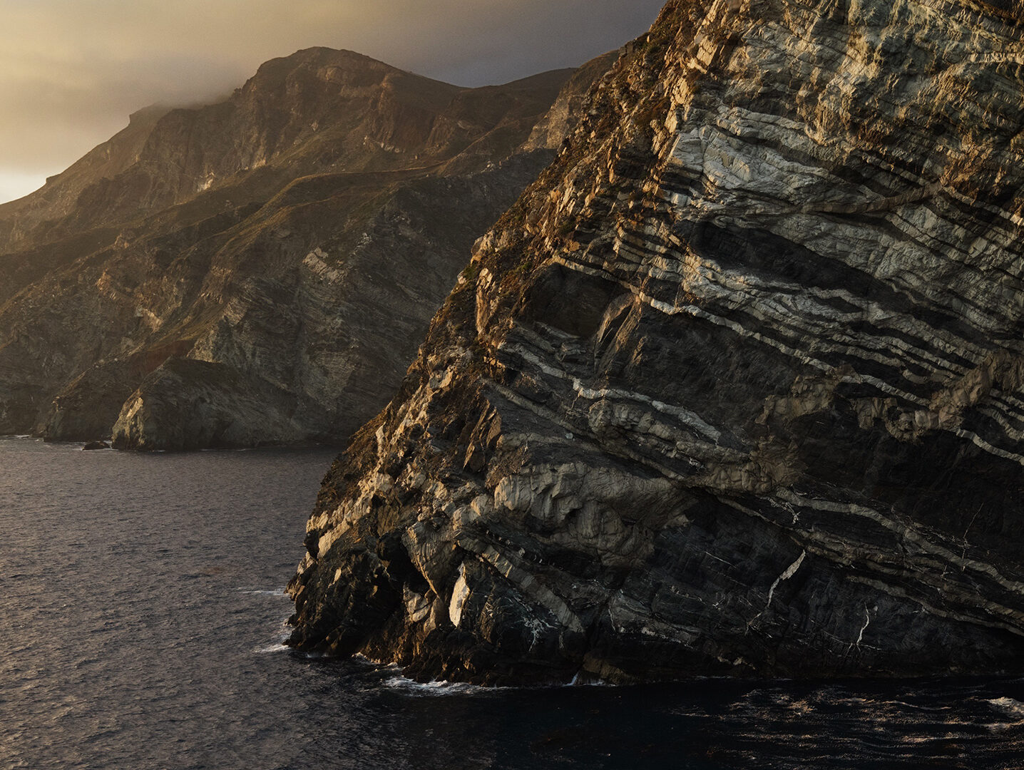 A rocky coastline meets dark water under a cloudy sky, forming a steep incline. The light reflects off the rock face, revealing layered textures and a warm yellow hue.