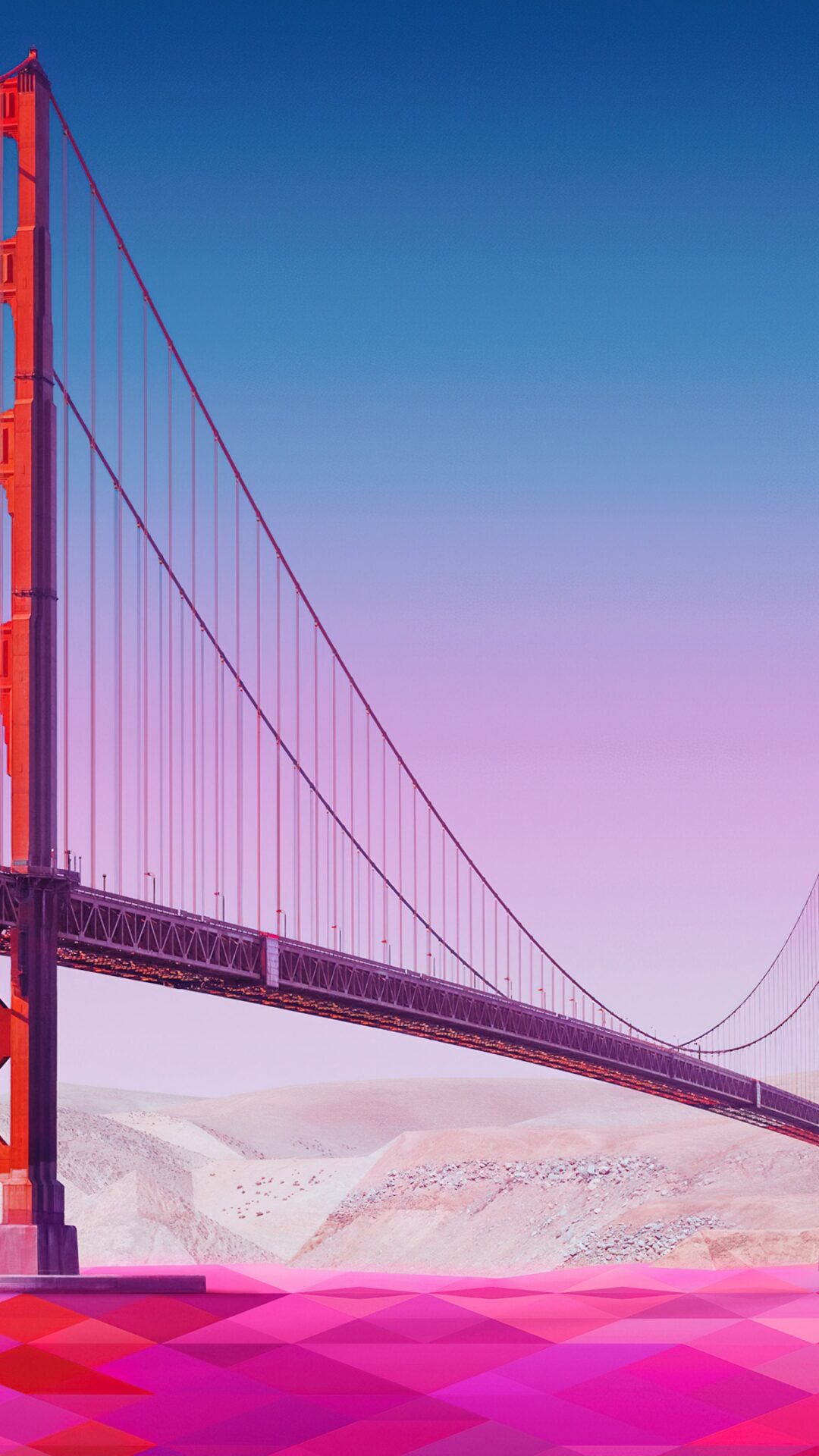 The red-orange suspension bridge extends over water towards a distant, pale hill. A polygonal pattern in shades of pink and purple creates a textured foreground, contrasting with the smooth sky gradient.