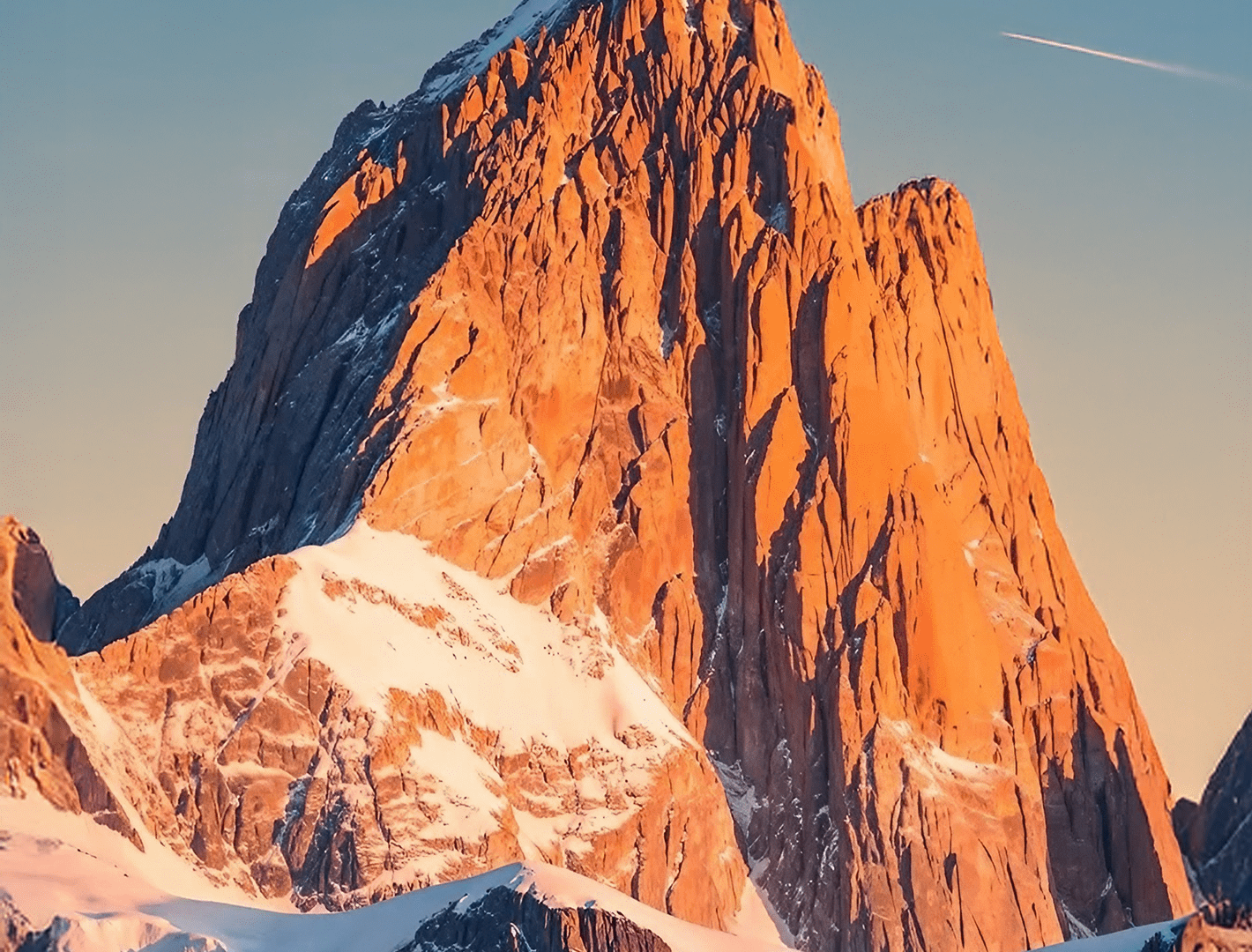 A large rocky mountain dominates the composition, ascending from a snow-covered base. Warm golden light highlights the textured rock face, creating strong shadows and a sense of depth.