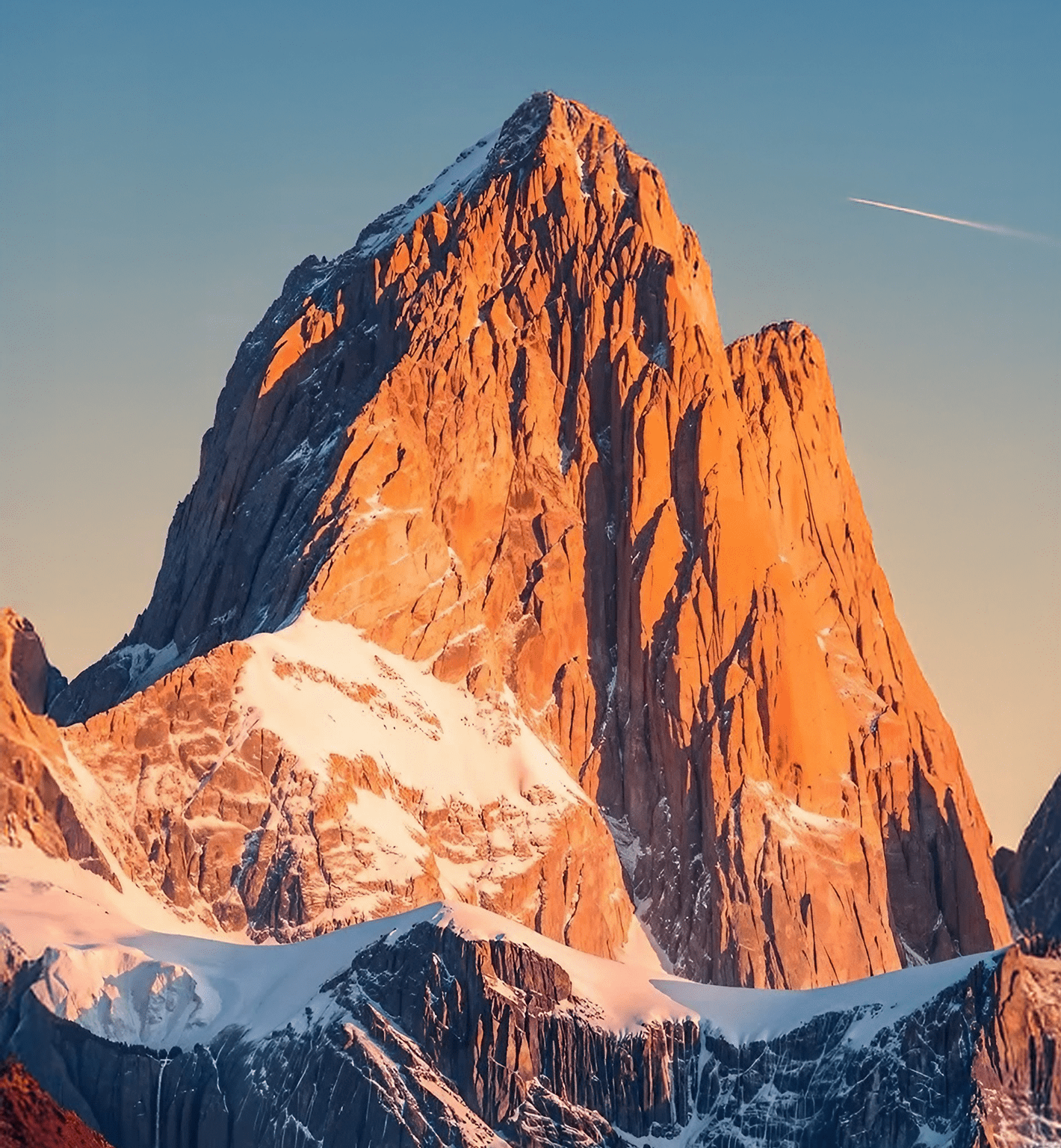 A large rocky mountain dominates the composition, ascending from a snow-covered base. Warm golden light highlights the textured rock face, c…
