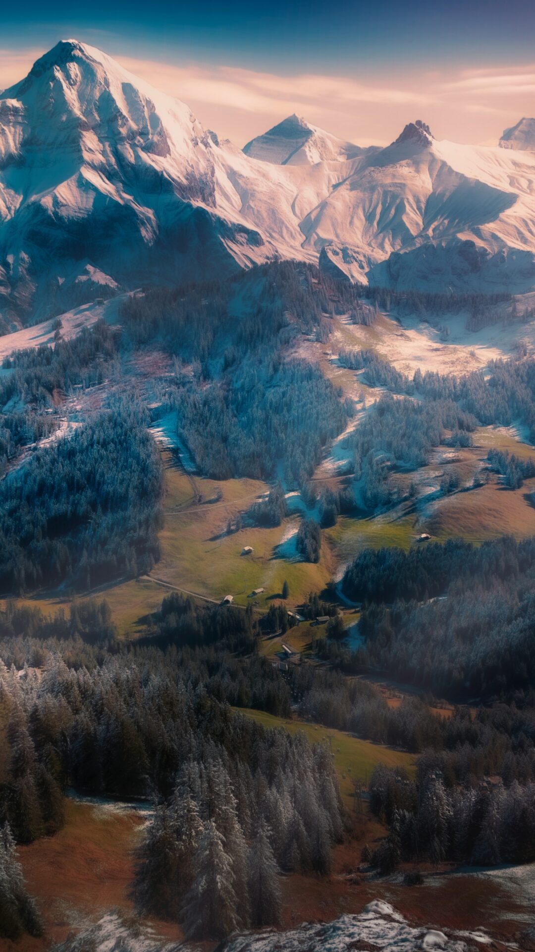 A wide view shows a complex mountain range with valleys and snow-covered peaks. Soft golden light highlights the rough textures of the rocky slopes and trees in the foreground.