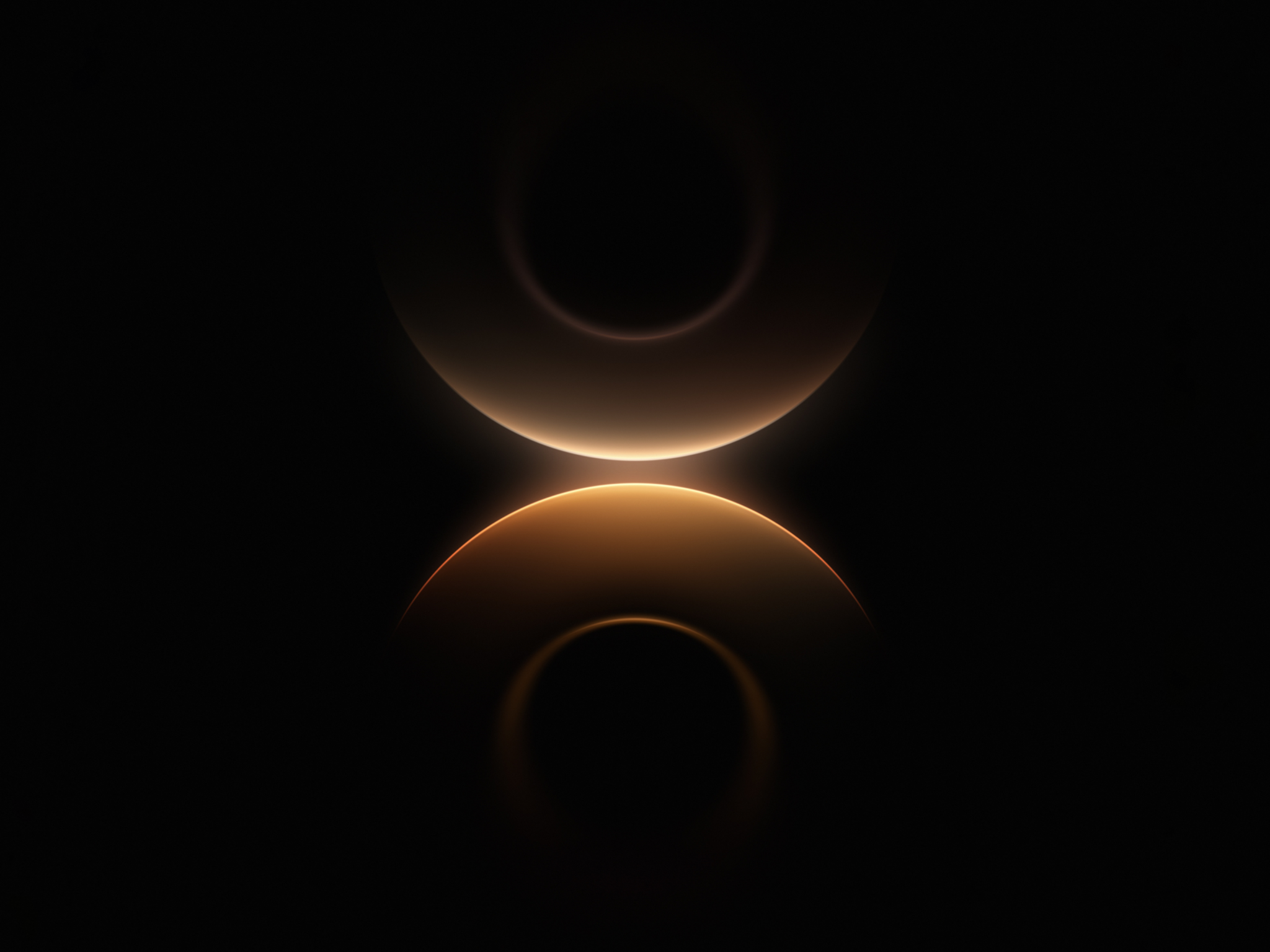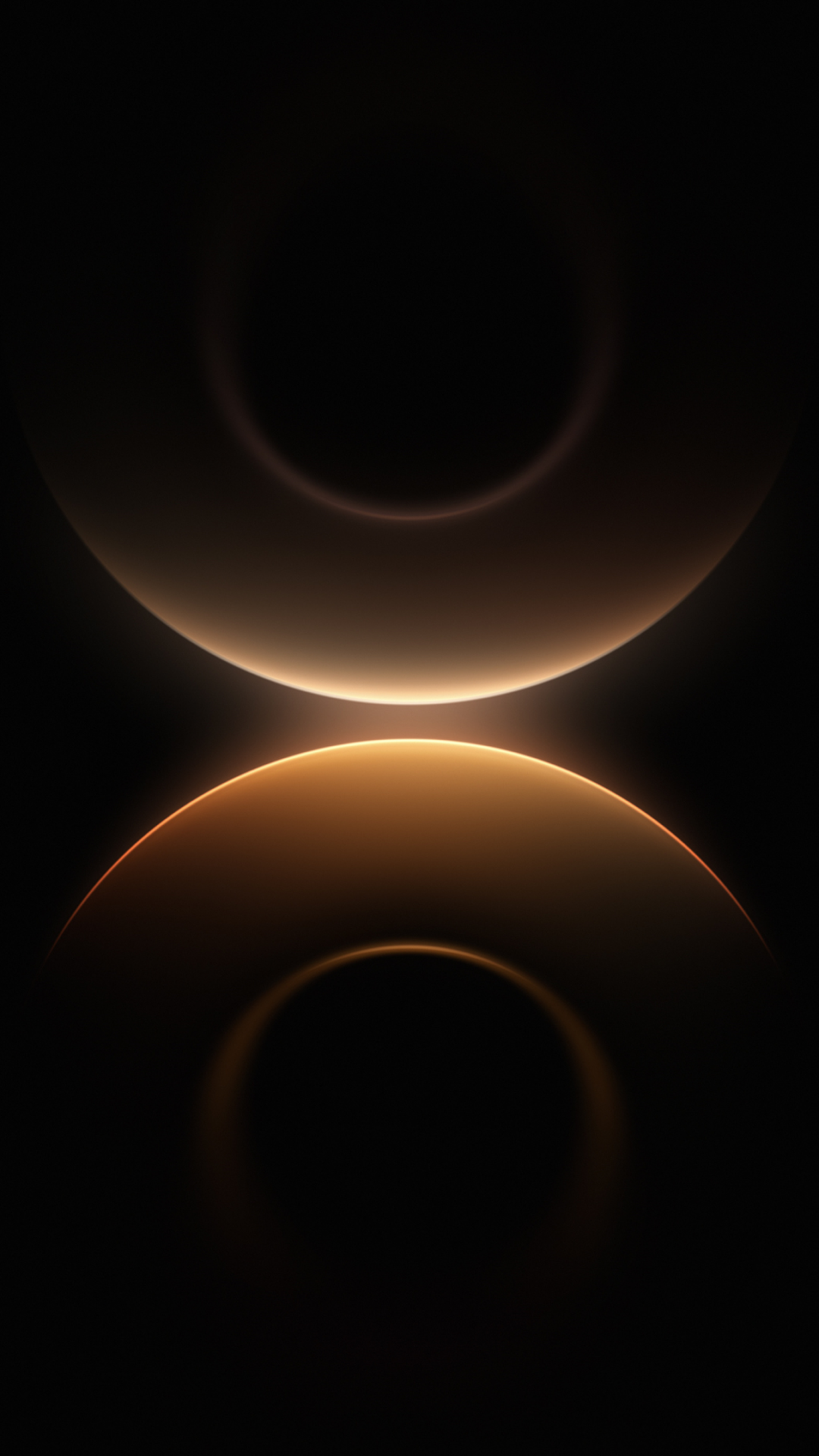 Glowing golden amber rings float against pure black, stacked vertically with a soft luminous glow where they meet in the center. The symmetr…