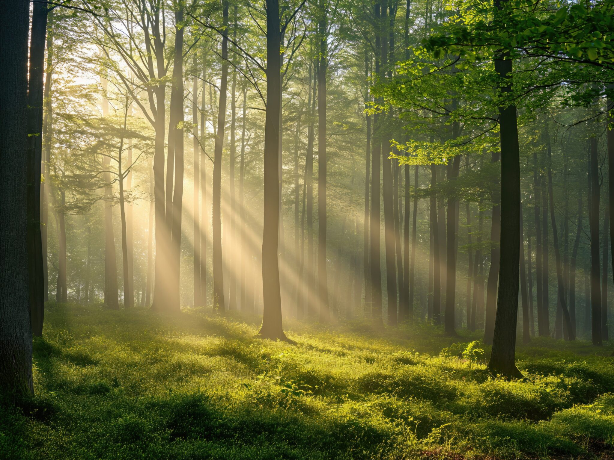 Gorgeous golden sunlight streams through tall green trees in this misty forest scene, with bright yellow rays illuminating the lush moss-covered ground. Works beautifully for 4K desktop wallpapers when you want that peaceful woodland atmosphere.
