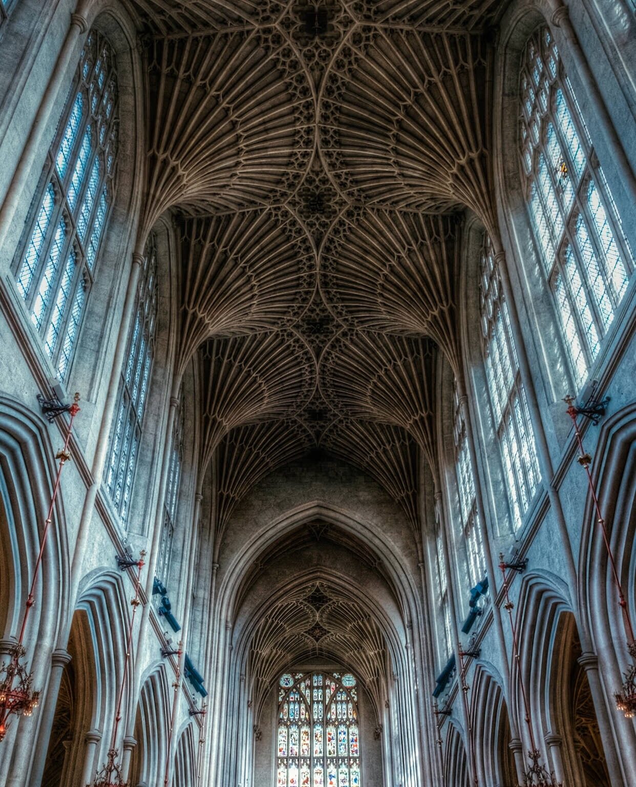 Stone ribs fan out across a vaulted ceiling in an intricate web of arches, with jewel-toned stained glass pulling color down into the nave. The upward angle makes the space feel infinite and weightless.