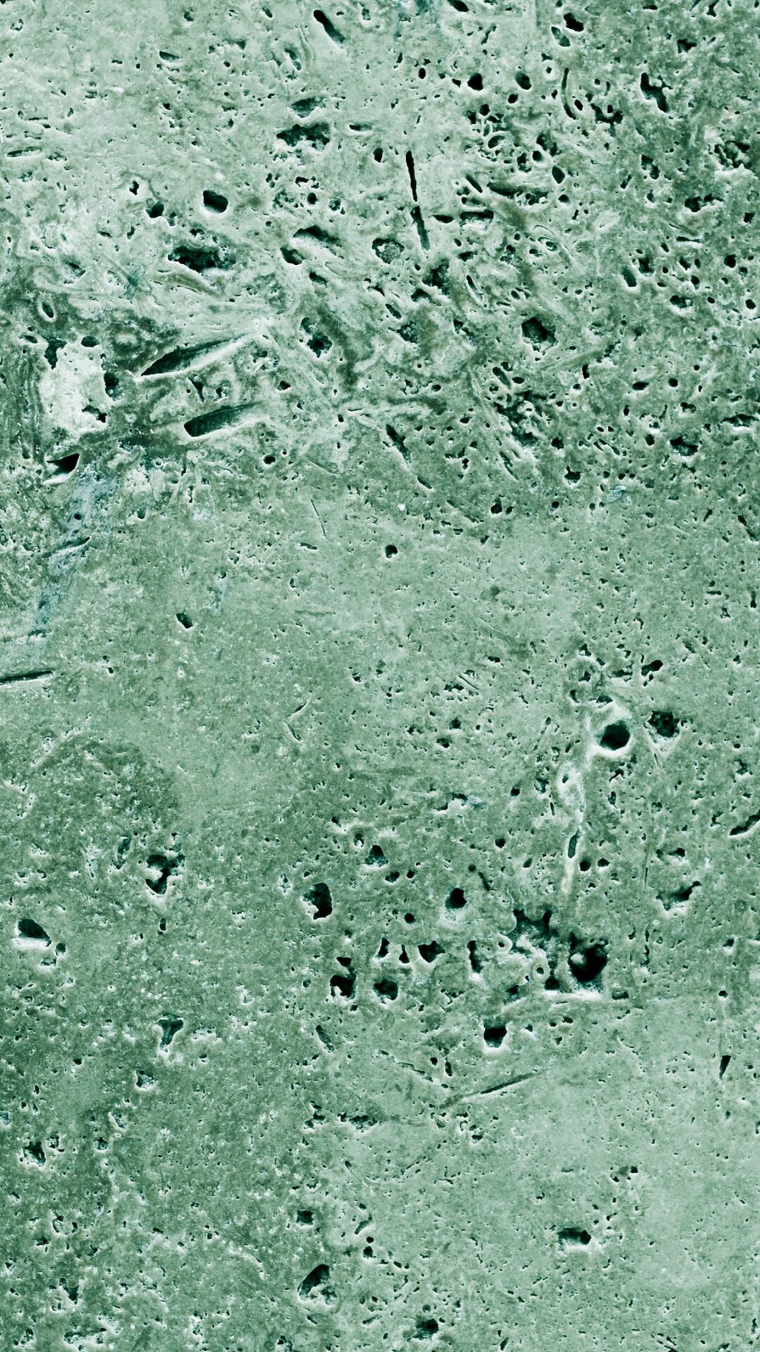 The full frame shows a close-up of a worn, green concrete surface. Small pits and cracks create a subtle depth and varied texture across the…