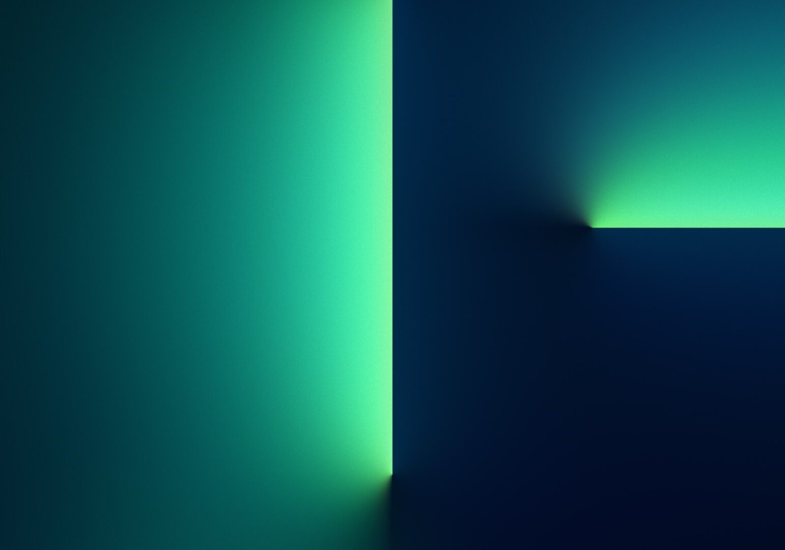 Dark teal and black geometric shapes create a minimalist, angular composition. Soft green light highlights the edges and reveals subtle grad…