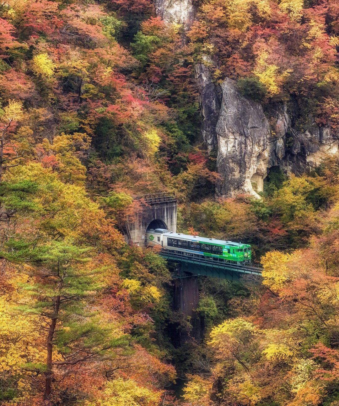 A green passenger train rolls out of a tunnel onto a bridge, dwarfed by a towering cliffside exploding in fall color. The contrast between s…