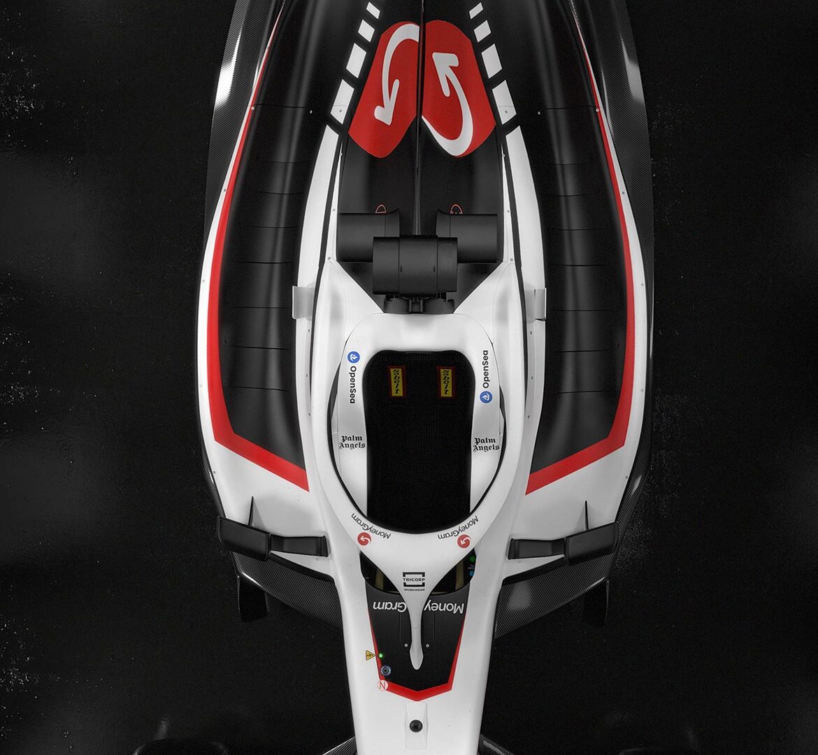 A Haas Formula 1 car is pictured from directly above, filling the frame. The dark background emphasizes the glossy finish and detailed spons…