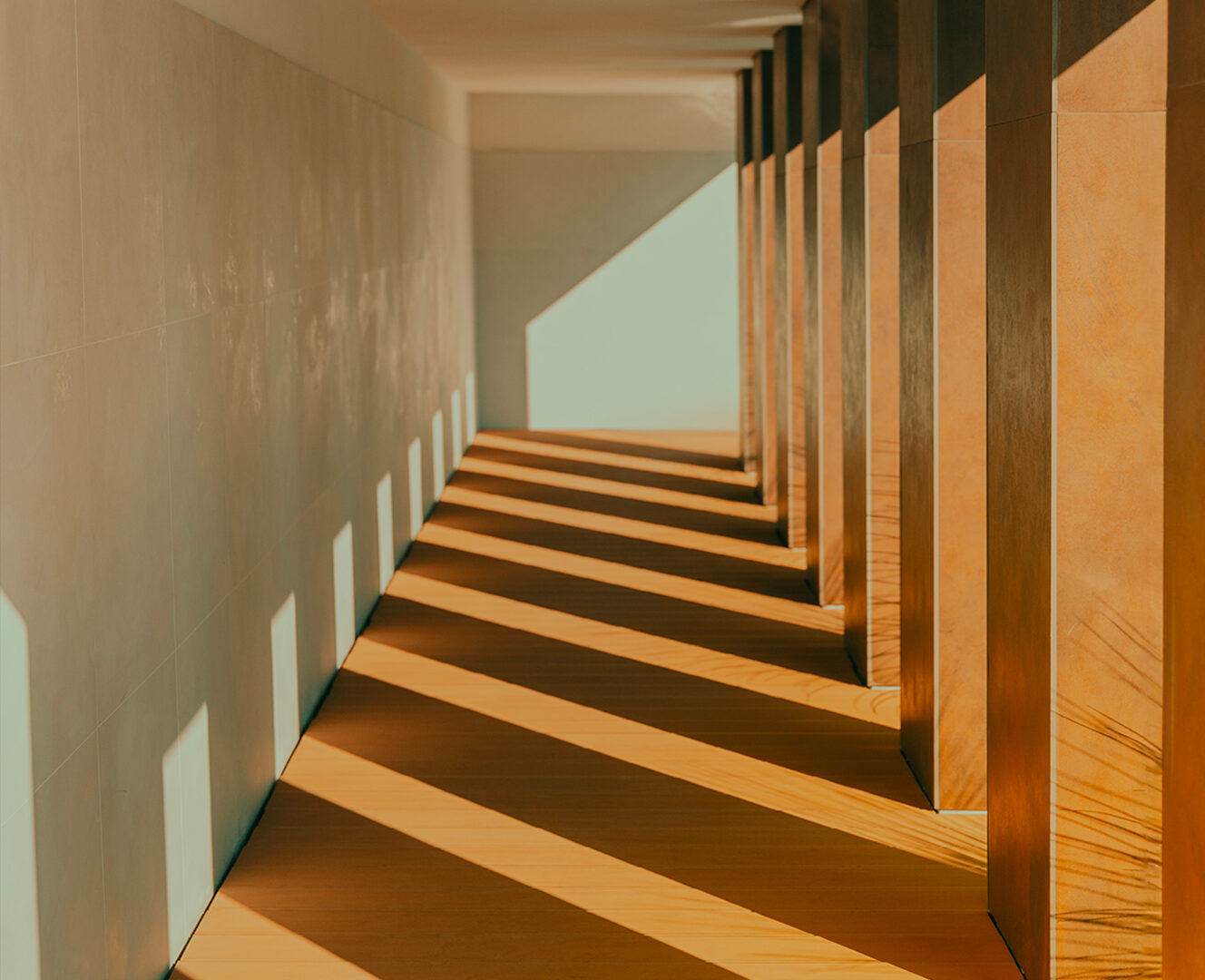 A long hallway recedes into the distance, framed by regularly spaced wooden columns and smooth walls. Strong diagonal light creates sharp shadows across the wood floor and column faces, establishing a sense of depth.