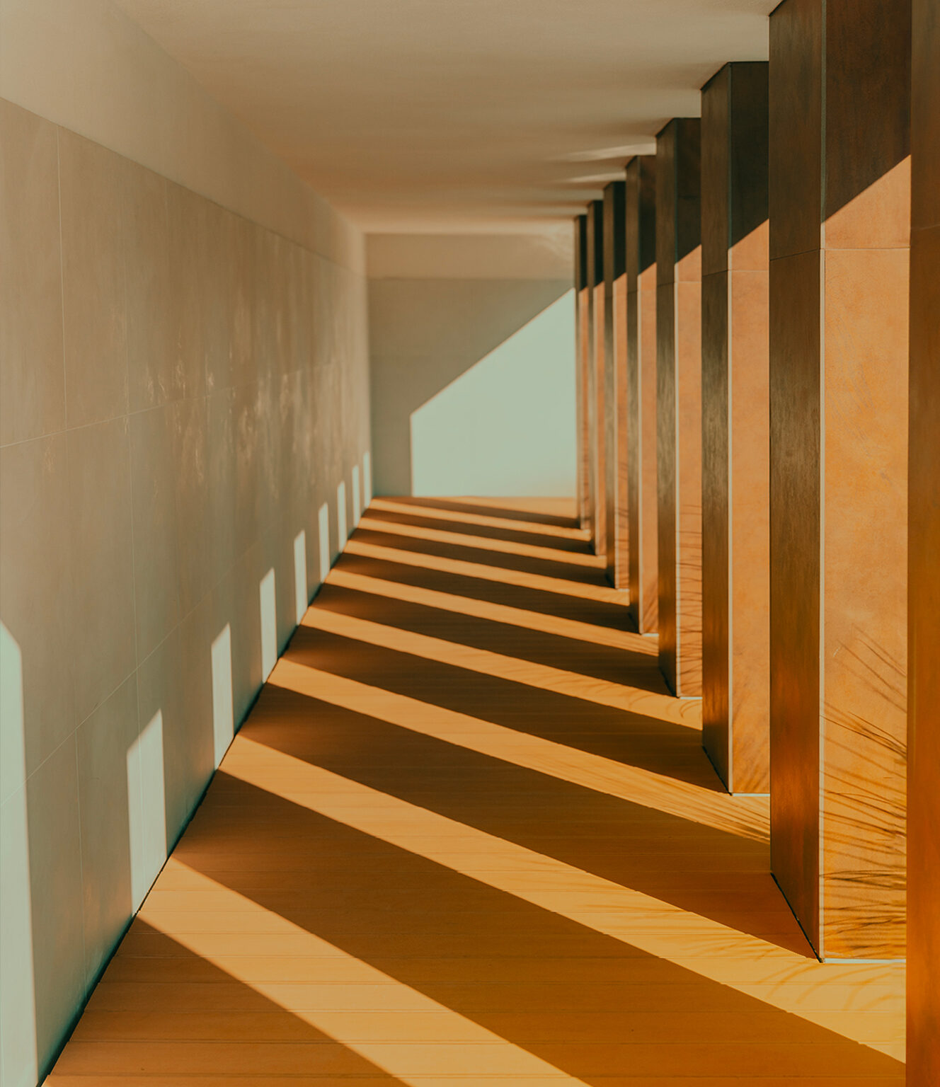 A long hallway recedes into the distance, framed by regularly spaced wooden columns and smooth walls. Strong diagonal light creates sharp sh…