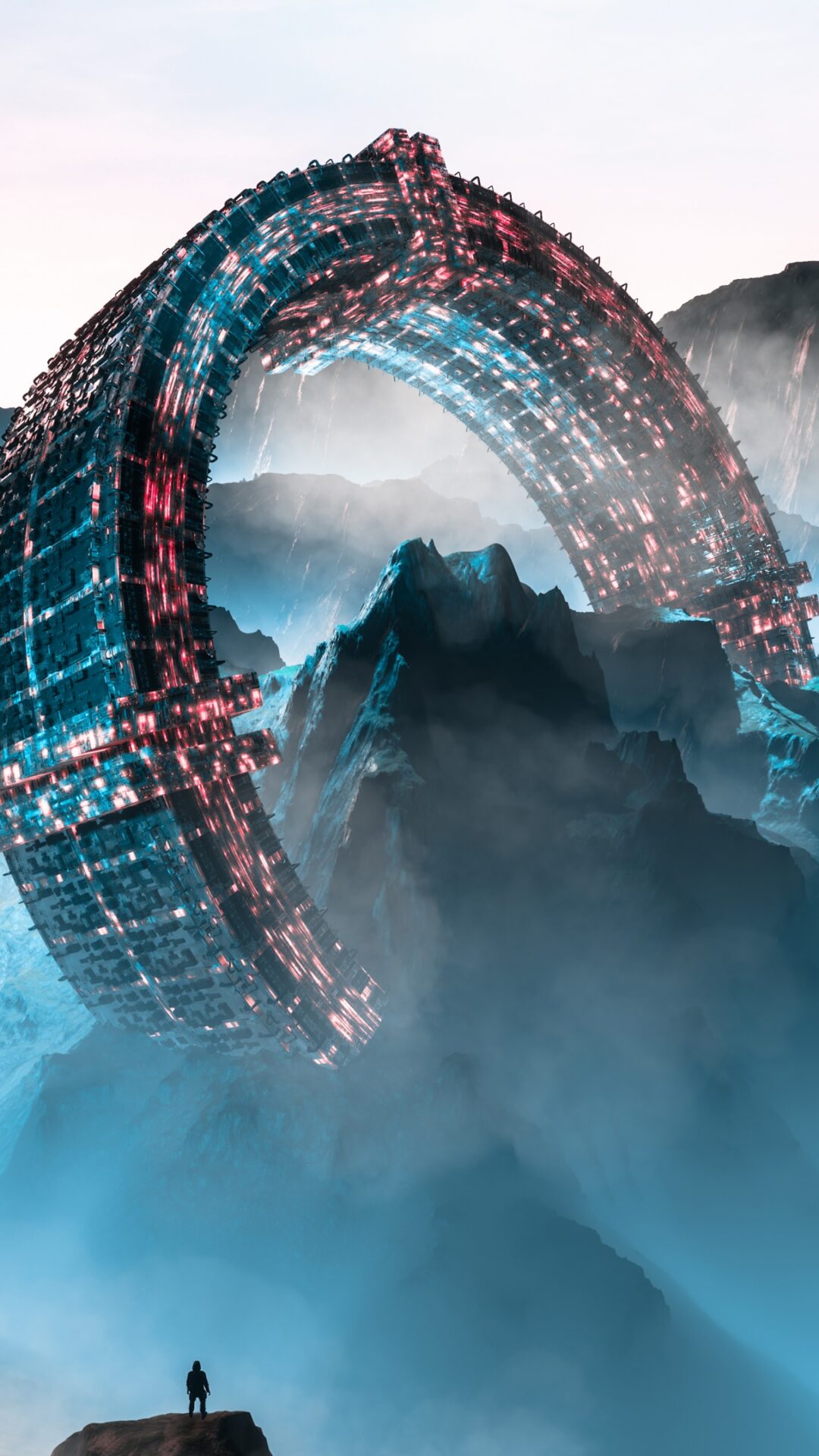 A large ring-shaped structure dominates the scene above a dark, rugged mountain range. The structure is detailed with internal red and blue