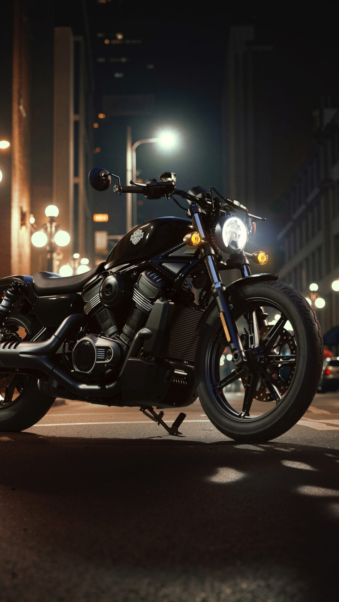 A black Harley-Davidson Nightster is parked on a city street at night. Warm light from streetlamps creates long shadows and highlights the bike’s metallic surfaces.
