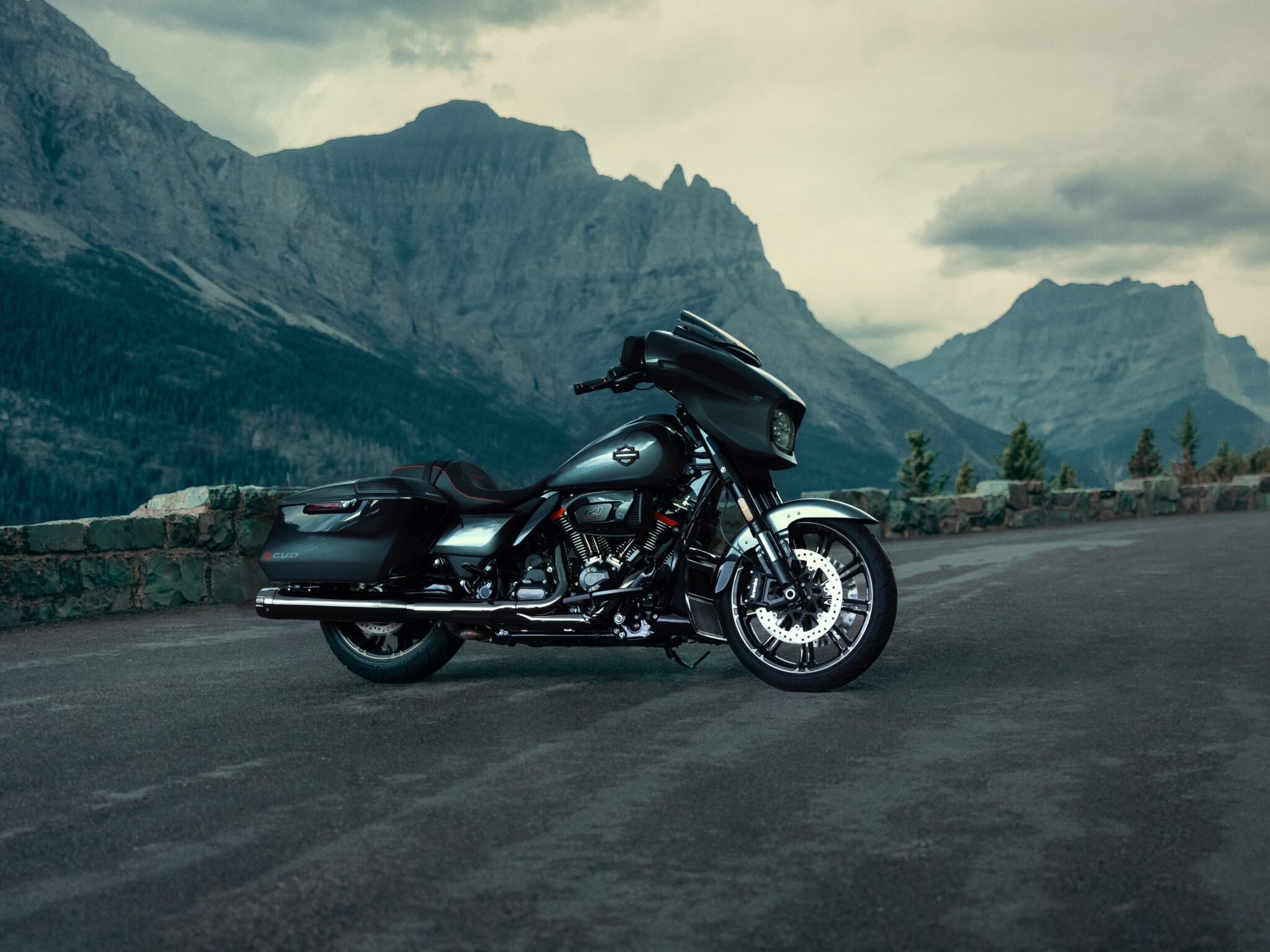 A black Harley-Davidson Road Glide is parked on a winding road with a mountain range in the background. The cool, muted color palette and so
