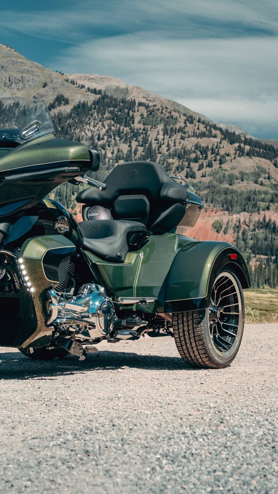 A dark green Harley-Davidson trike is parked on a gravel road with a mountain range in the background. Soft, diffused light casts subtle sha