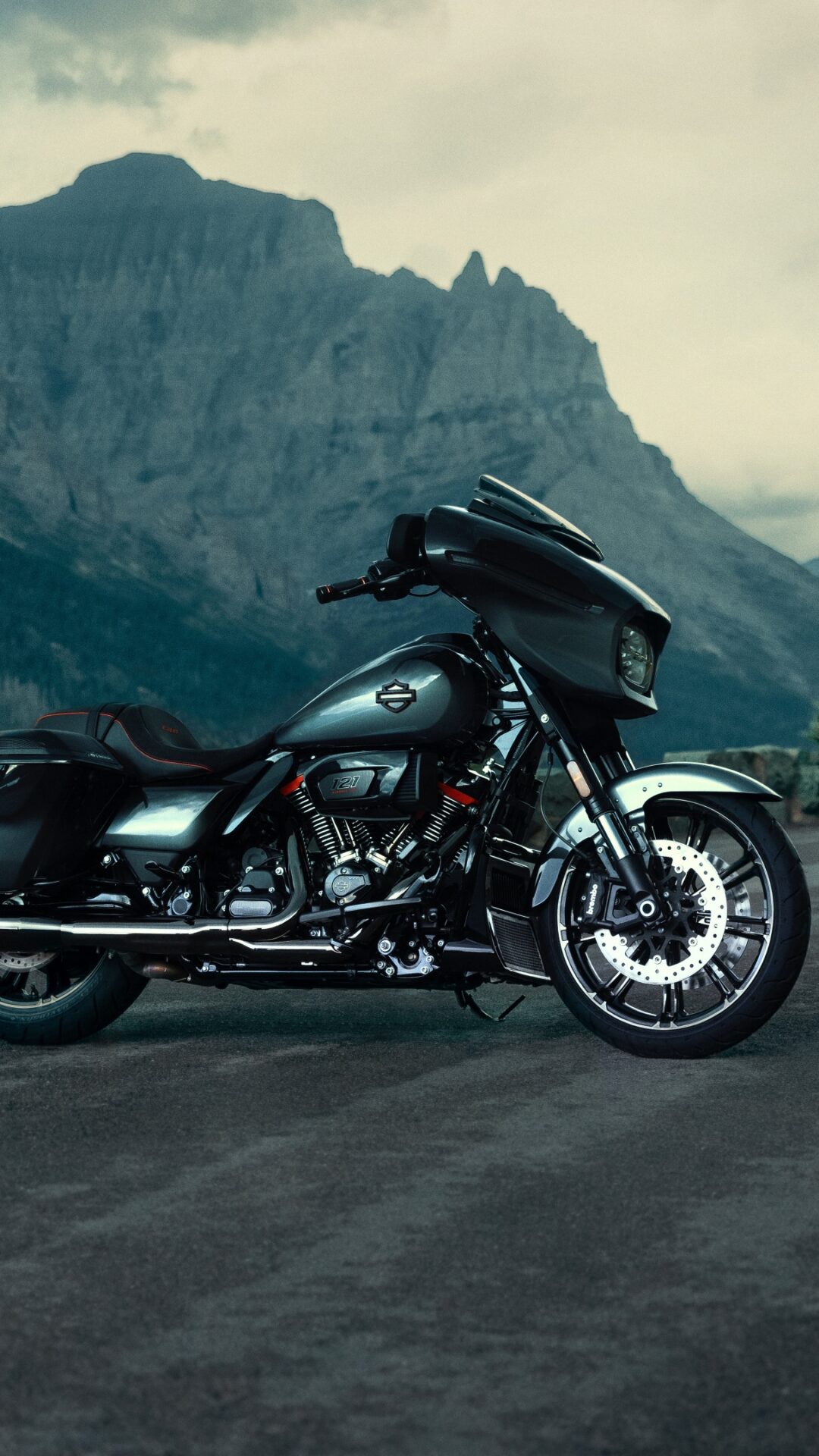 A black Harley-Davidson Road Glide is parked on a winding road with a mountain range in the background. The cool, muted color palette and so…