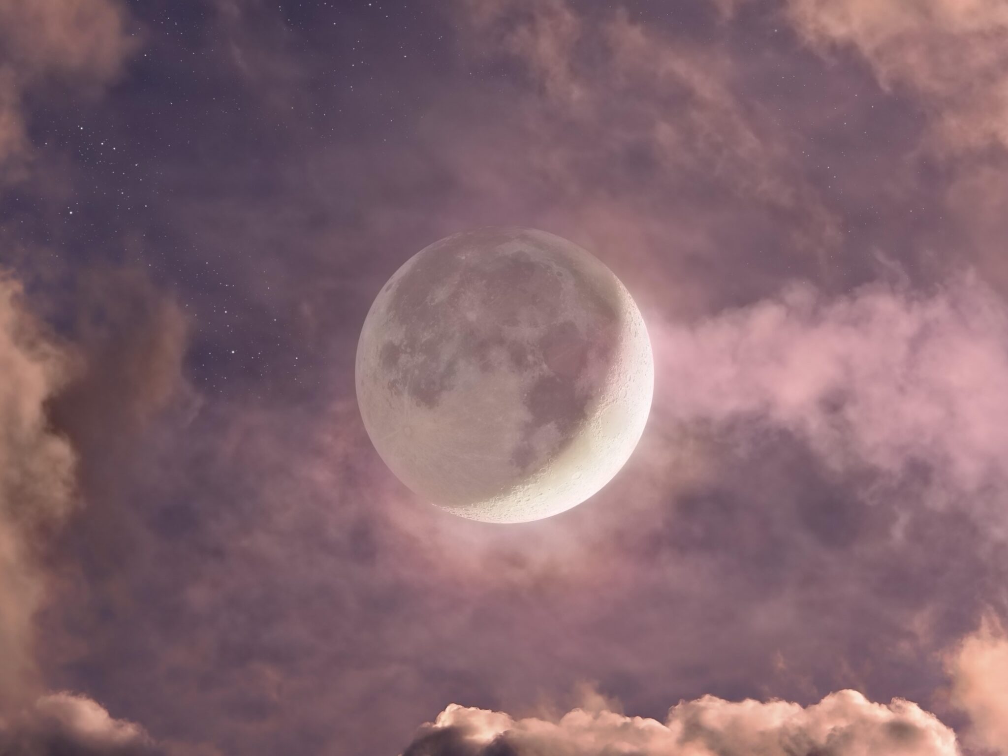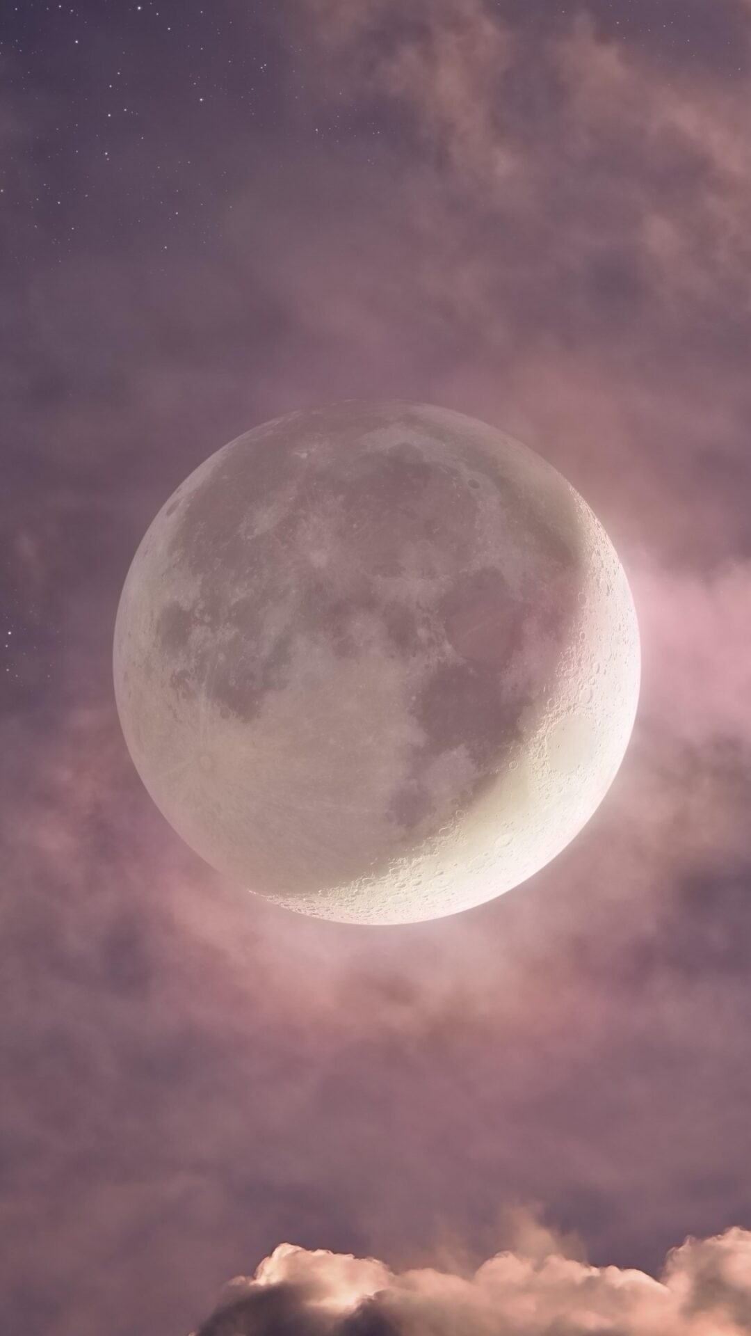 Luminous moon pierces through dramatic purple and pink clouds against a starlit sky, creating an ethereal glow that illuminates the surrounding atmosphere. Works beautifully for 4K desktop backgrounds when you want something mystical and dreamy.