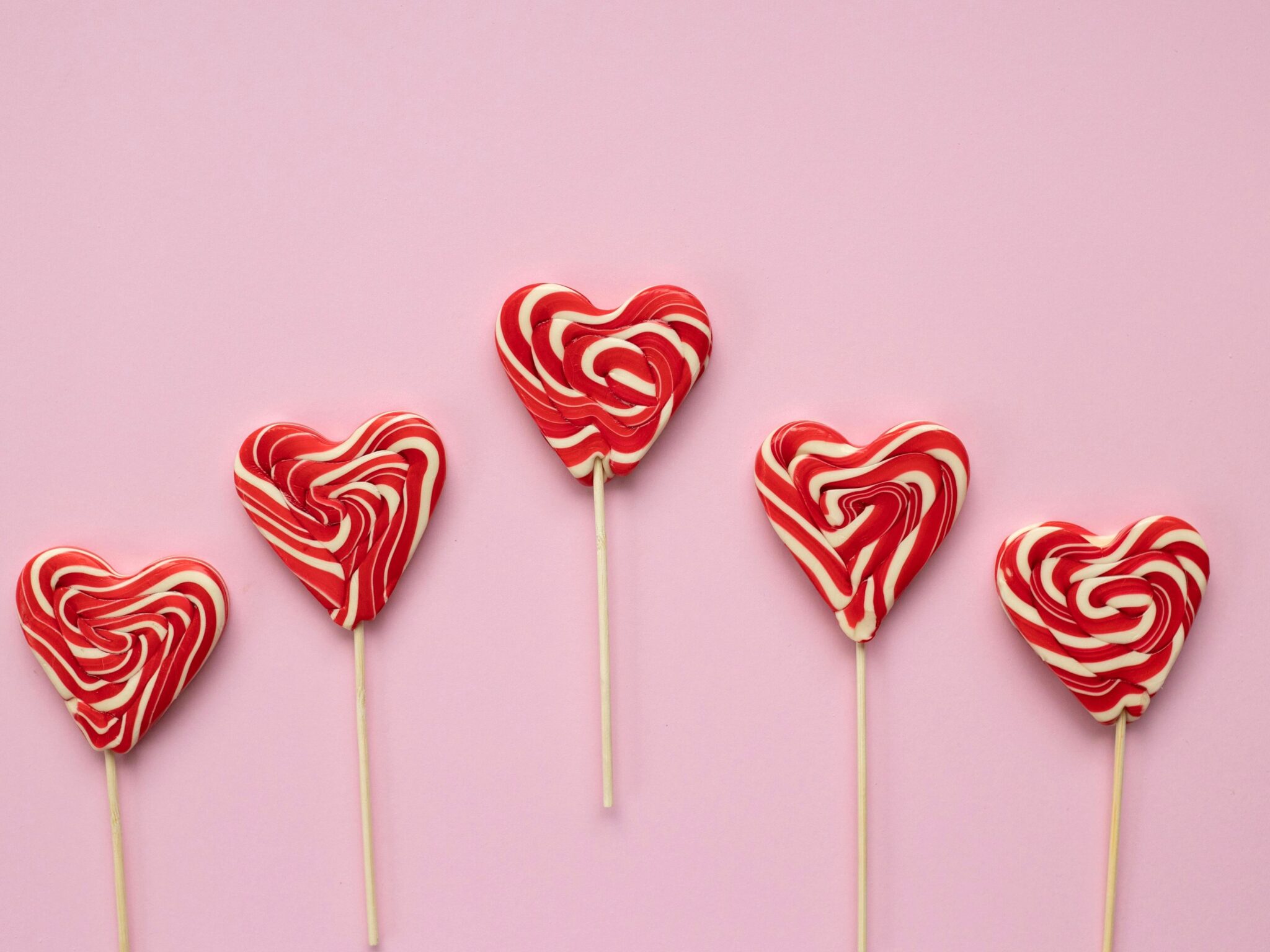 Five heart-shaped lollipops are arranged on a flat pink surface. The bright red candy has swirling white patterns and casts soft shadows on …