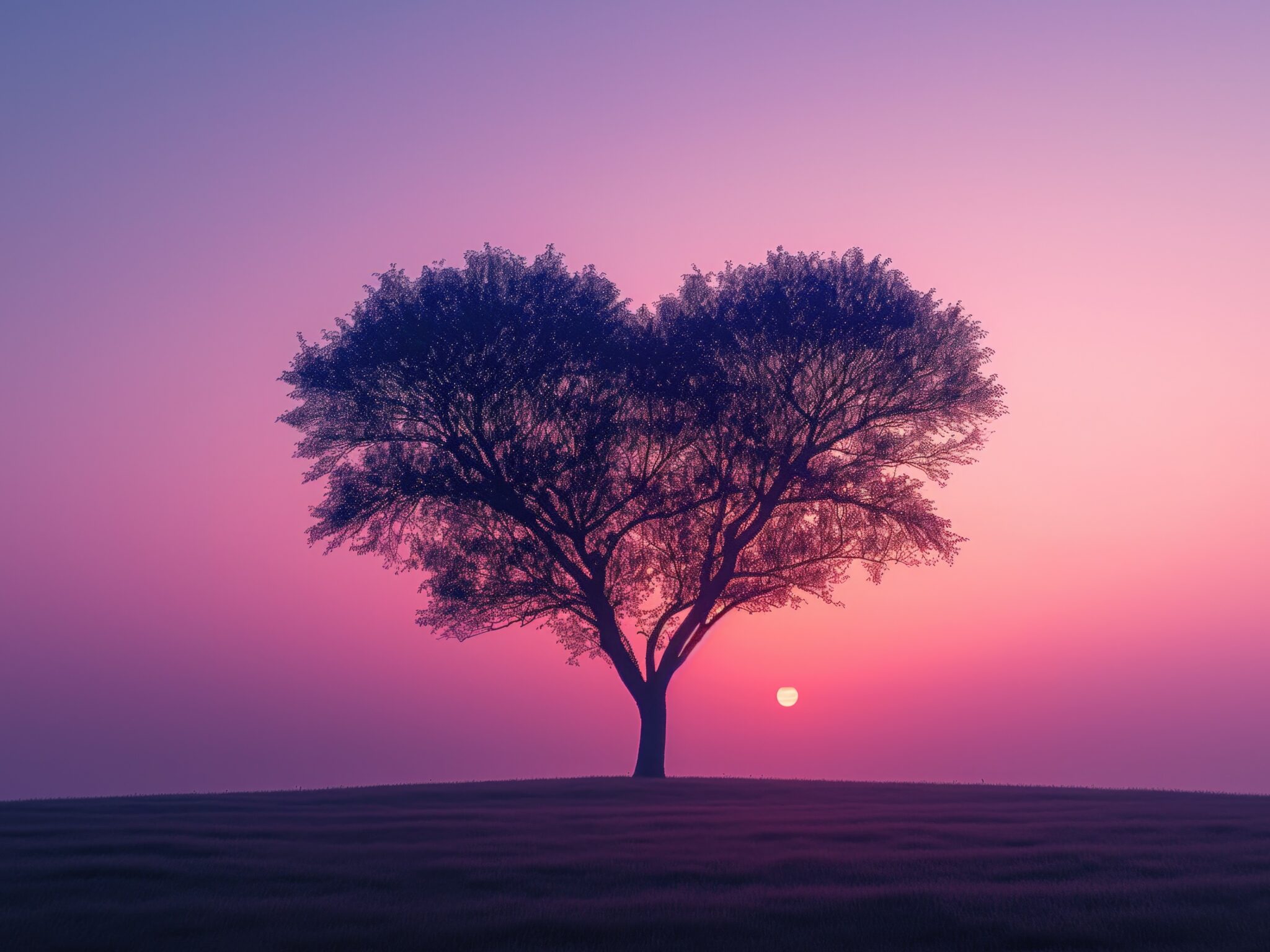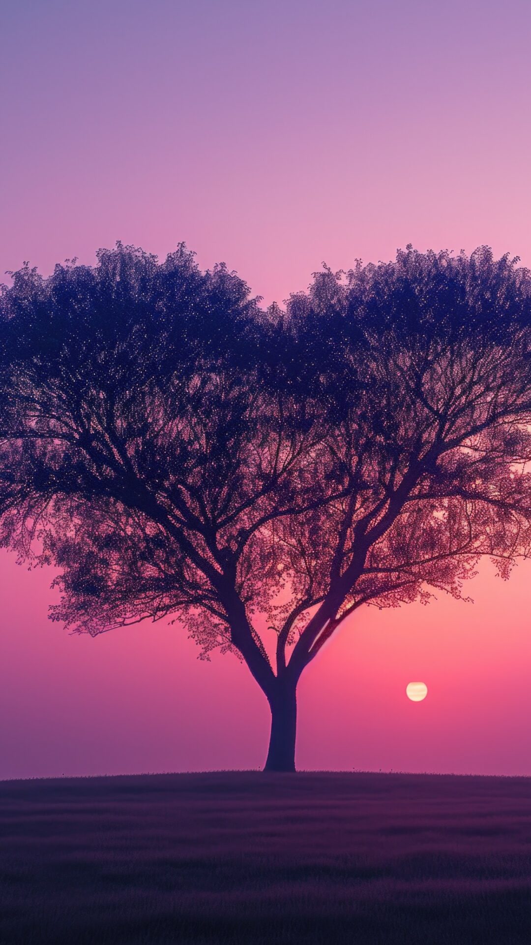 A solitary tree with a heart-shaped canopy stands silhouetted against a dreamy pink and purple sunset sky. This romantic nature wallpaper wo…