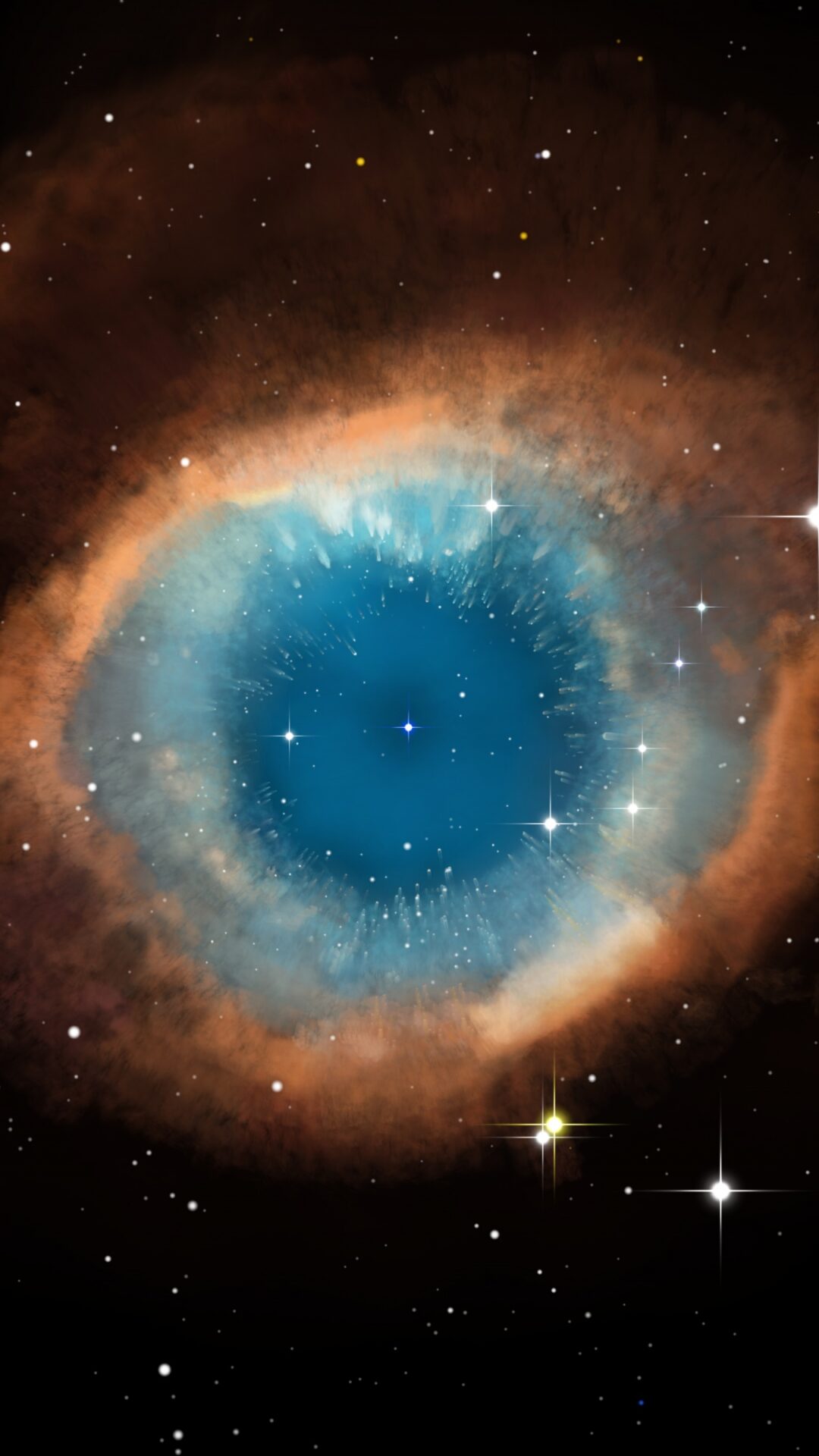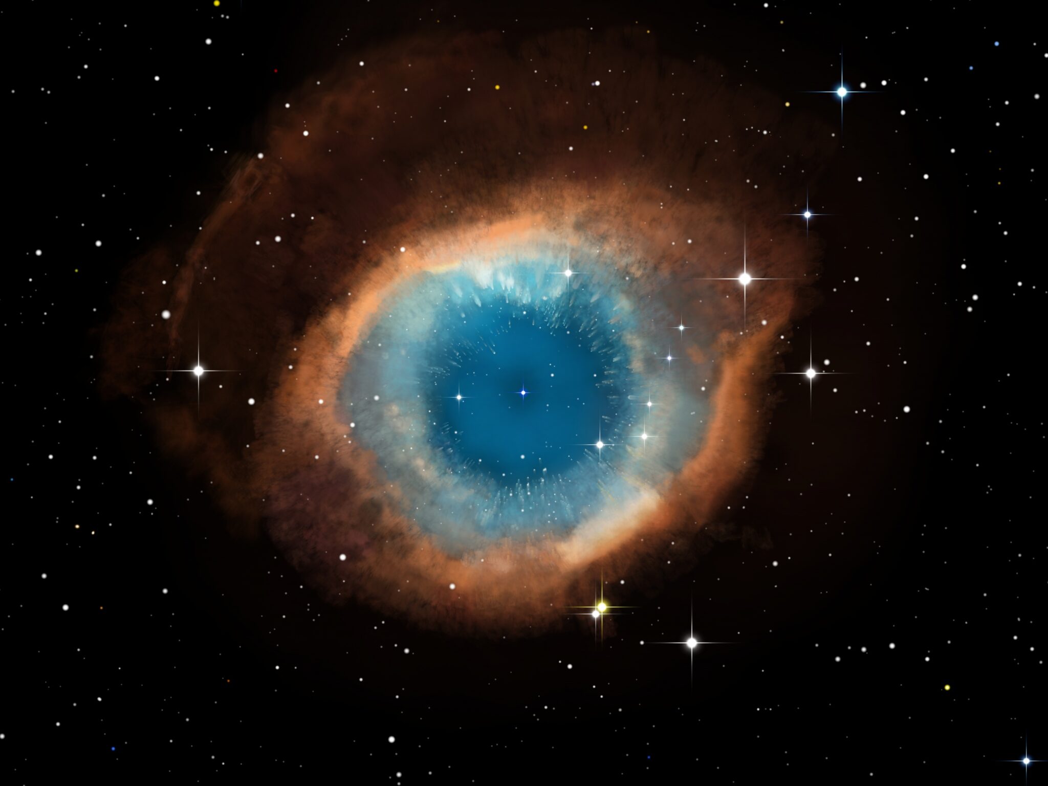 The Helix Nebula glows with vibrant blue at its center surrounded by orange and reddish gas clouds, creating an eye-like appearance against …