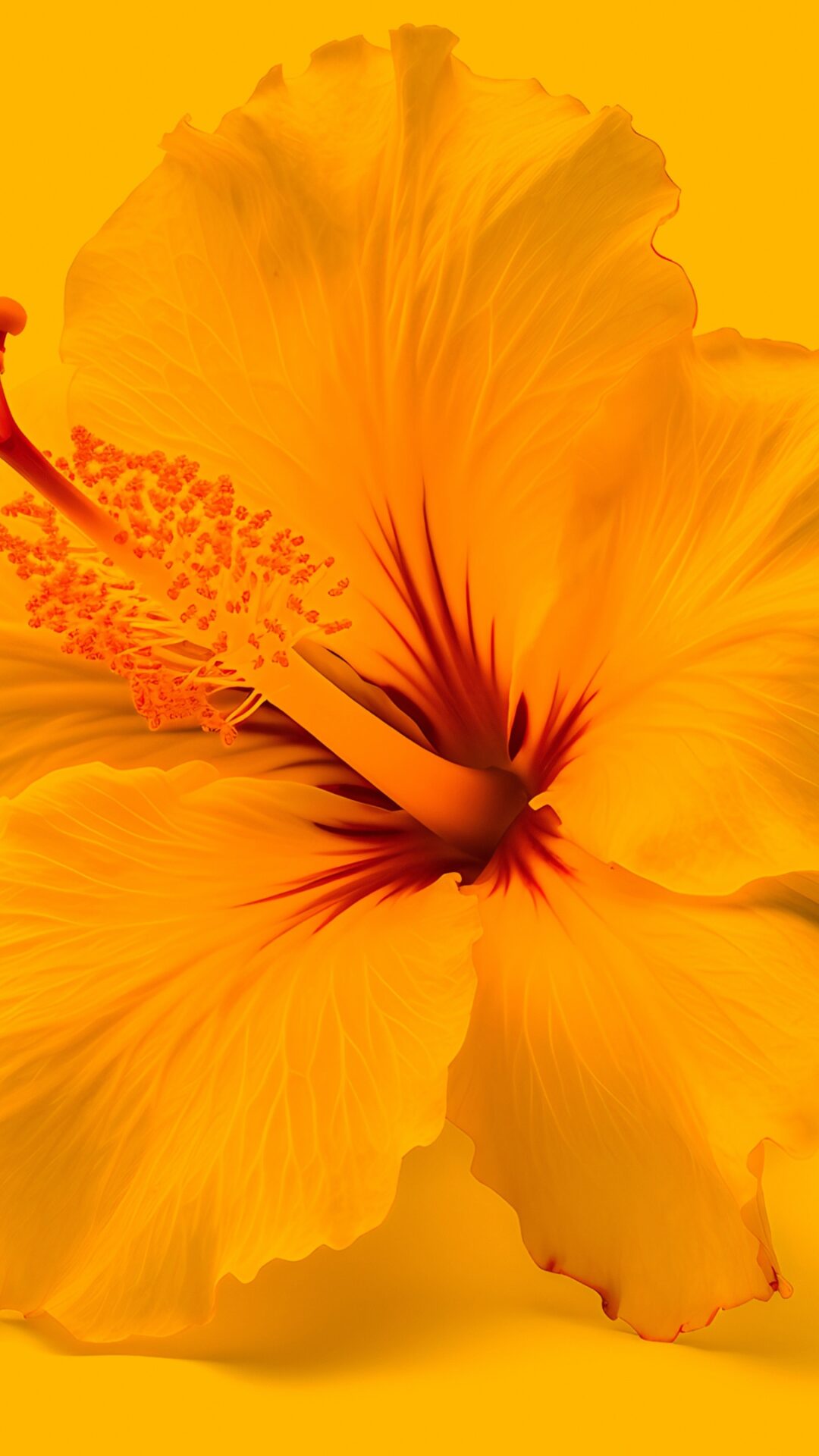A single hibiscus flower is centered against a solid yellow background. The petals are a soft, diffused yellow, while the flower's center sh…