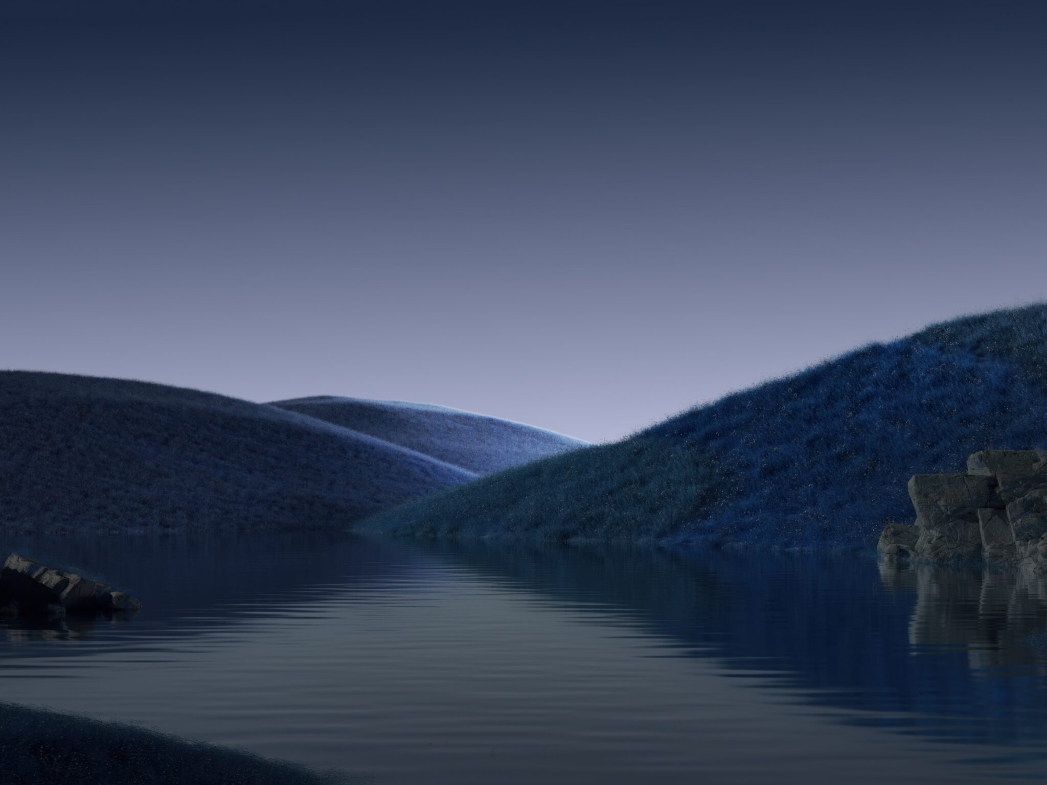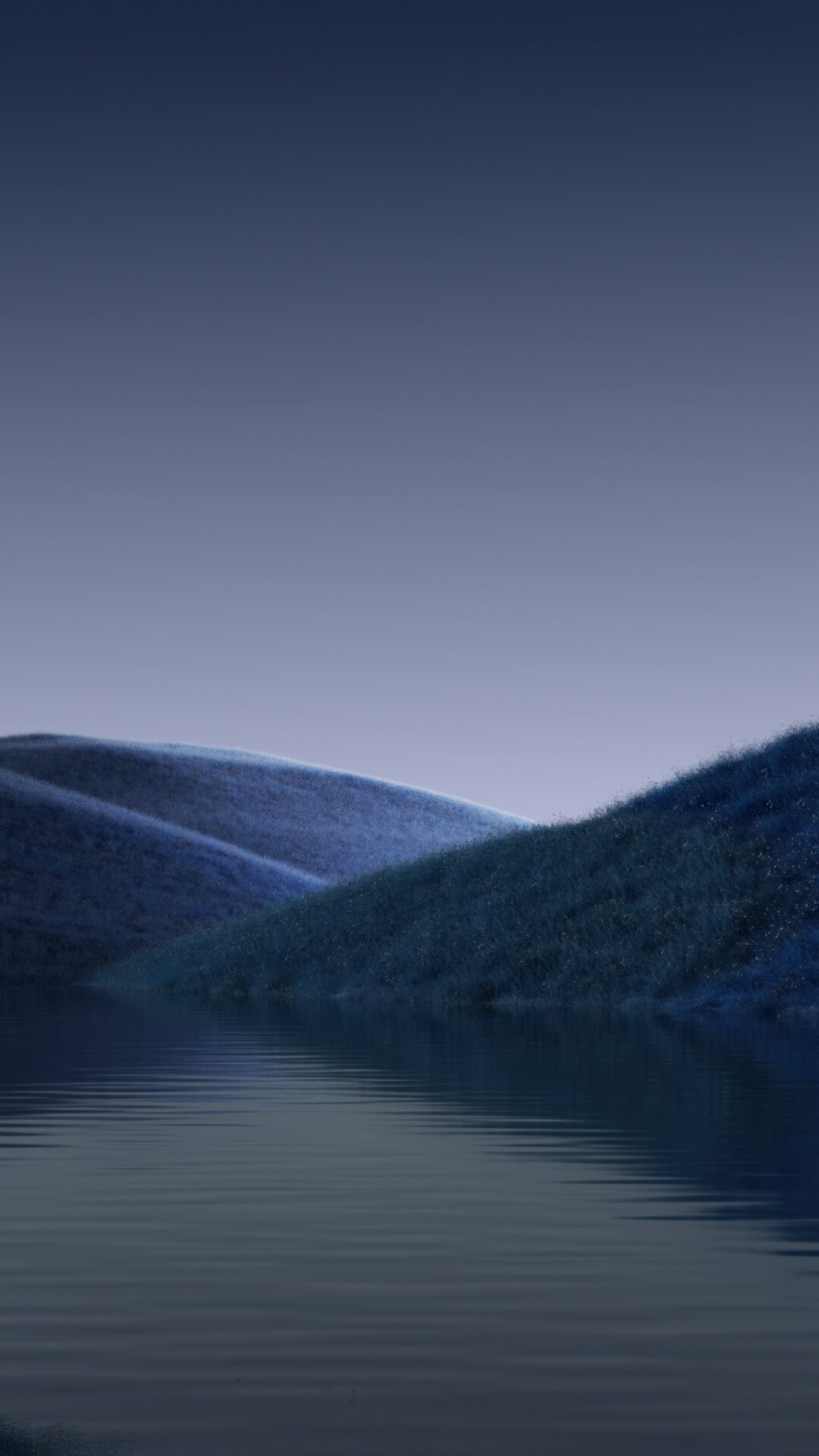 Rolling hills are reflected in a still body of water, creating a symmetrical composition. The scene is dominated by cool, muted blue tones a