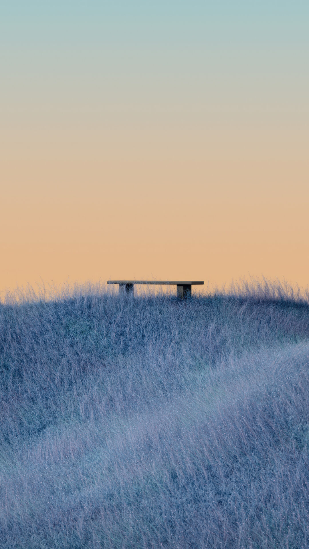 A wooden bench rests on the crest of a grassy hill, partially obscured by low-lying fog. Soft gradients of pale orange and blue create a sub…