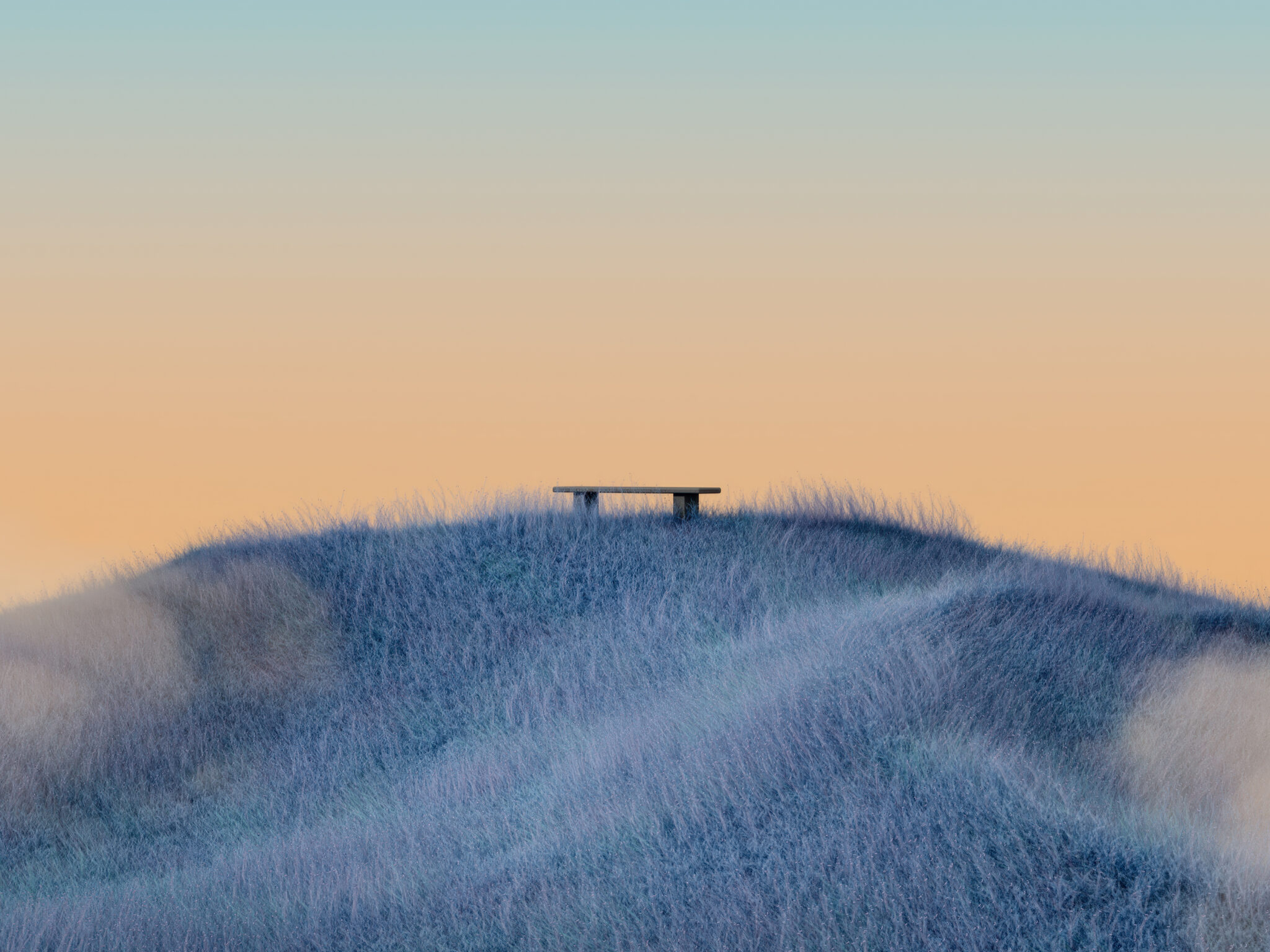 A wooden bench rests on the crest of a grassy hill, partially obscured by low-lying fog. Soft gradients of pale orange and blue create a subdued, atmospheric light.