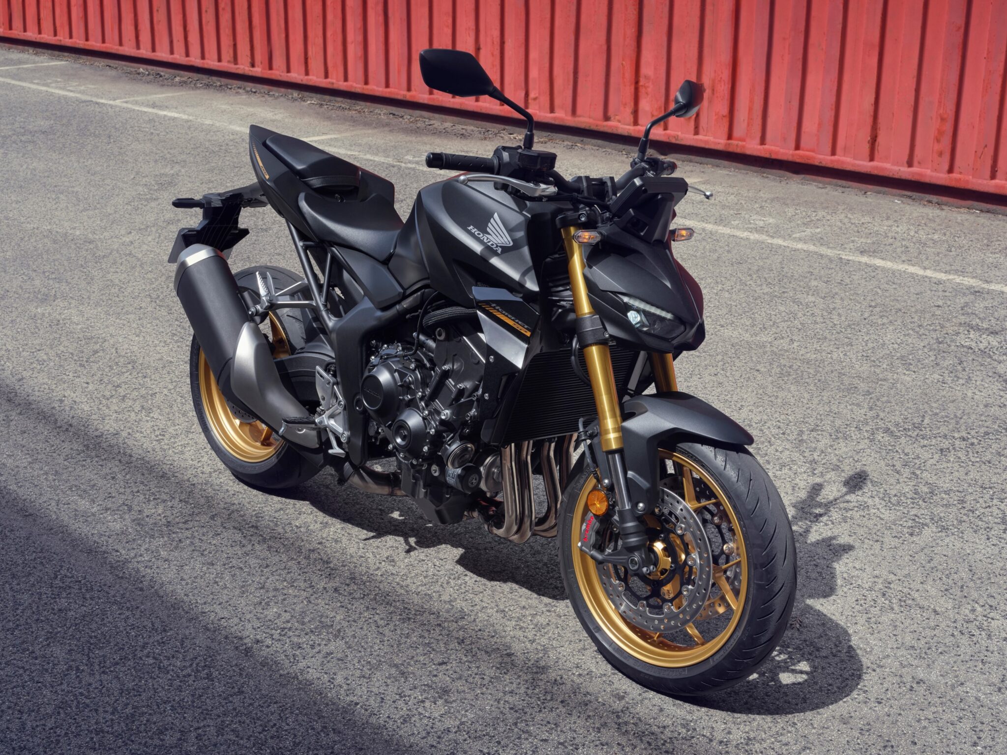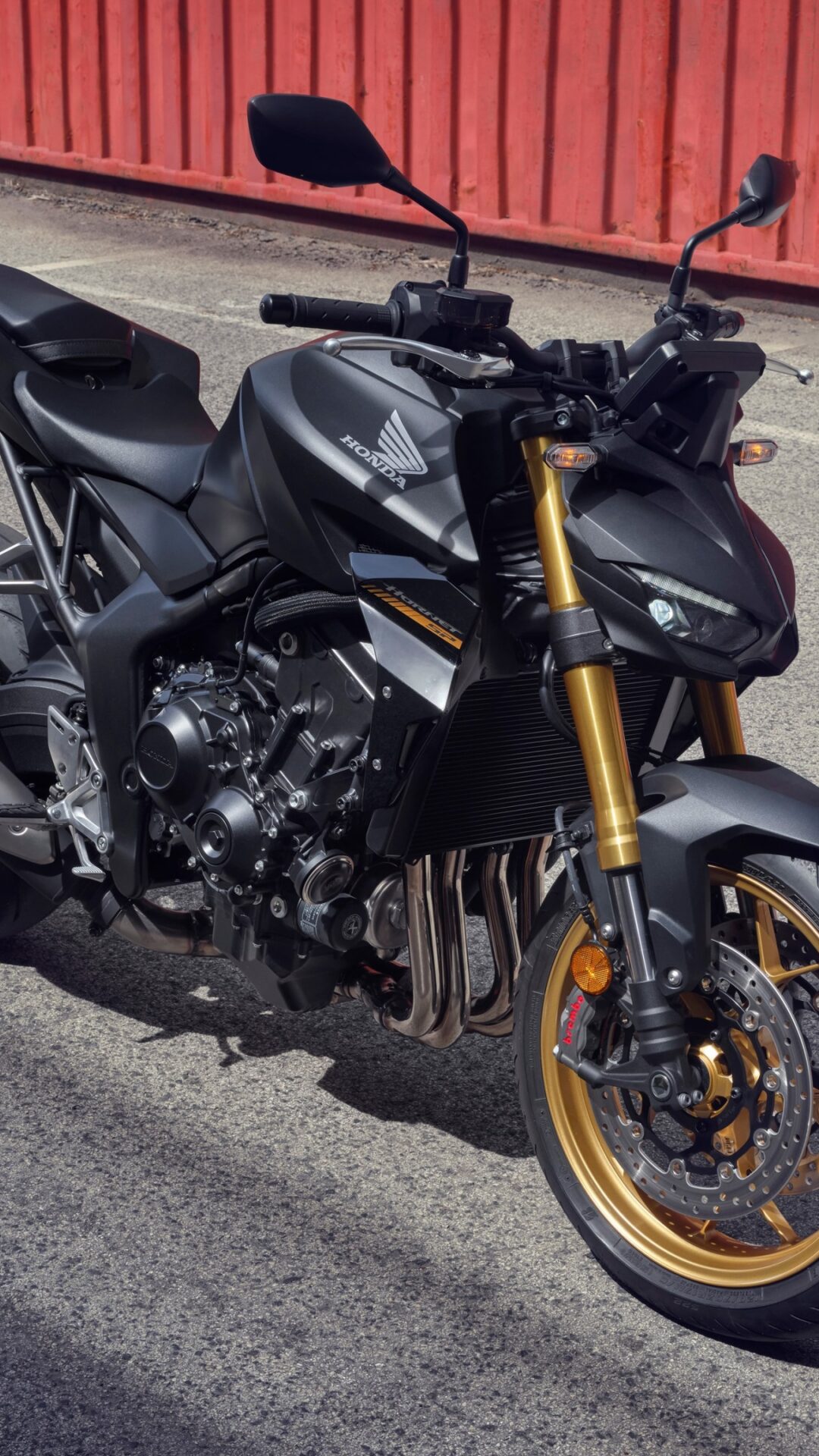 A dark grey Honda CB1000R sport bike is positioned on asphalt in front of a red corrugated metal wall. Gold accents on the wheels and front …