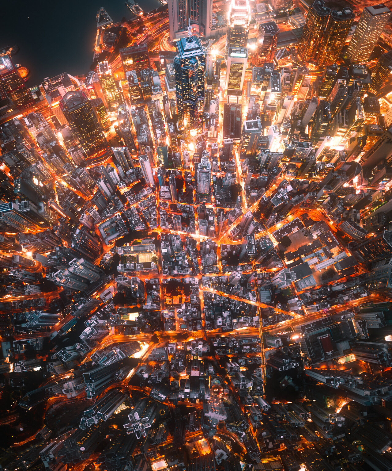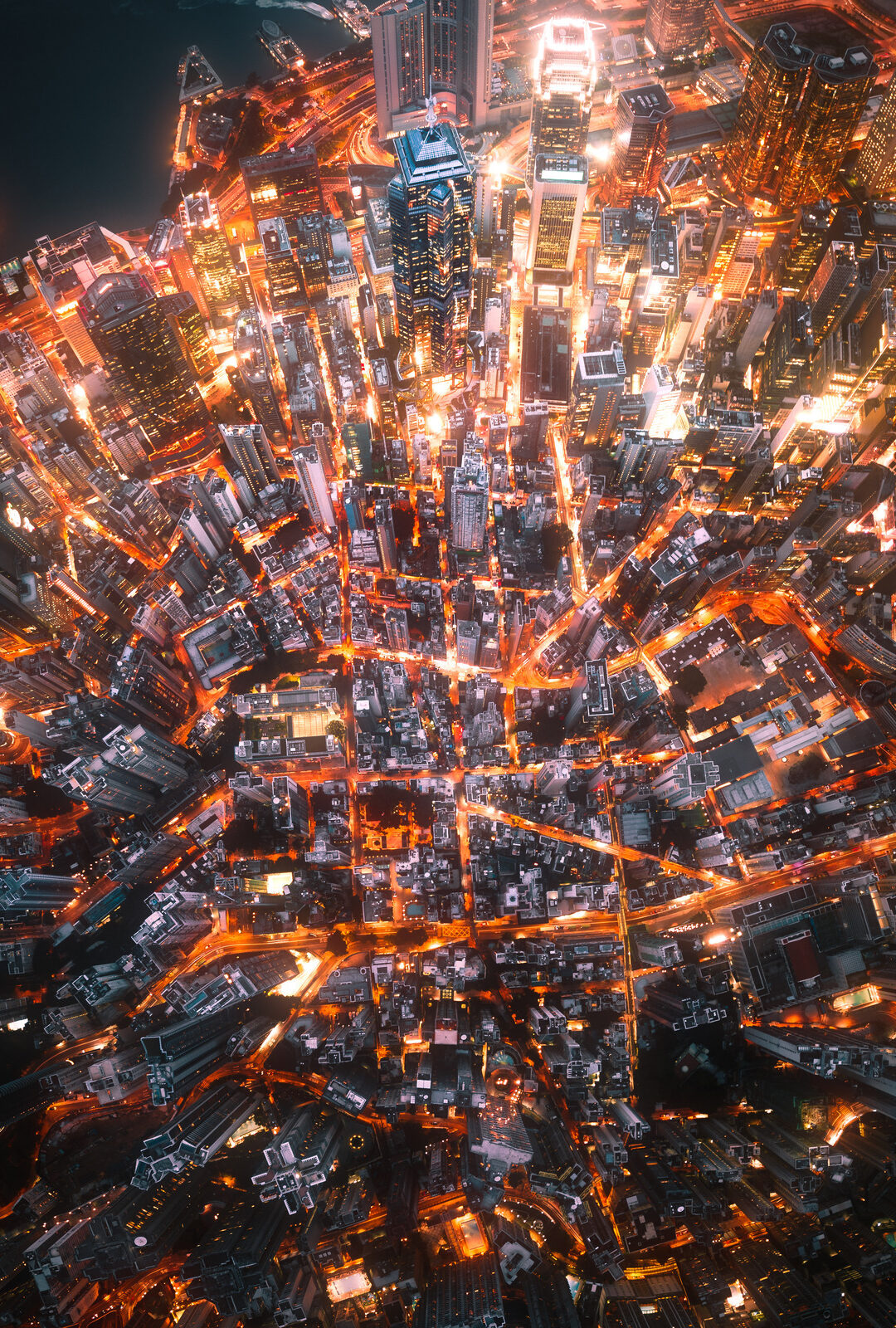 Shot from high above, Hong Kong's grid of towers and streets glows in a blaze of warm amber and white light. The density is overwhelming — e