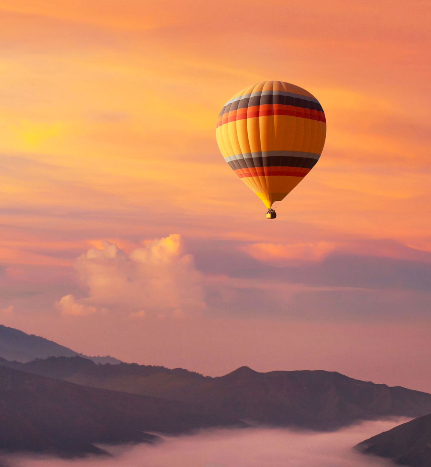 A hot air balloon ascends over a mountain range filled with low-lying fog. Warm orange and yellow tones saturate the sky and the balloon's stripes, creating a soft glow.
