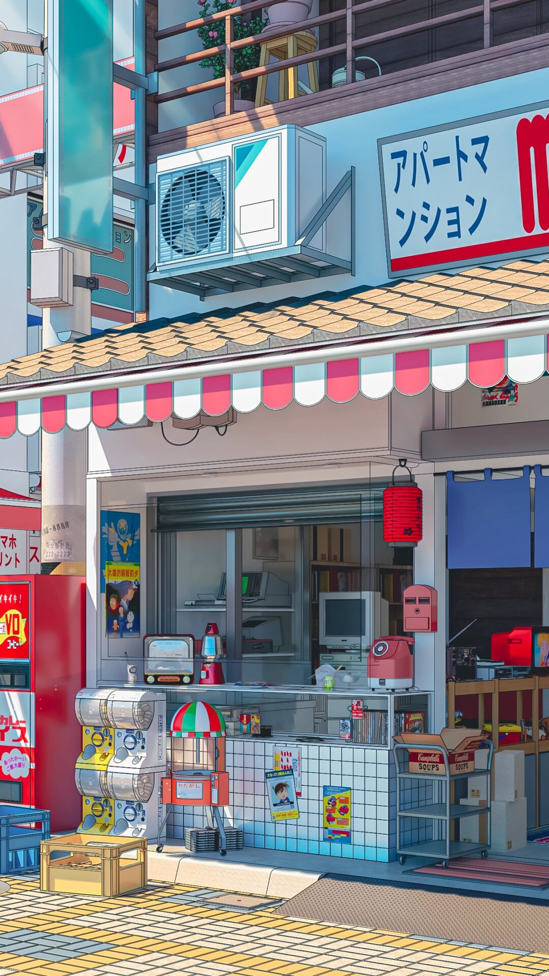 A Japanese street scene presents a small ice cream shop with a striped awning and storefront displays. Soft, diffused light highlights the p…