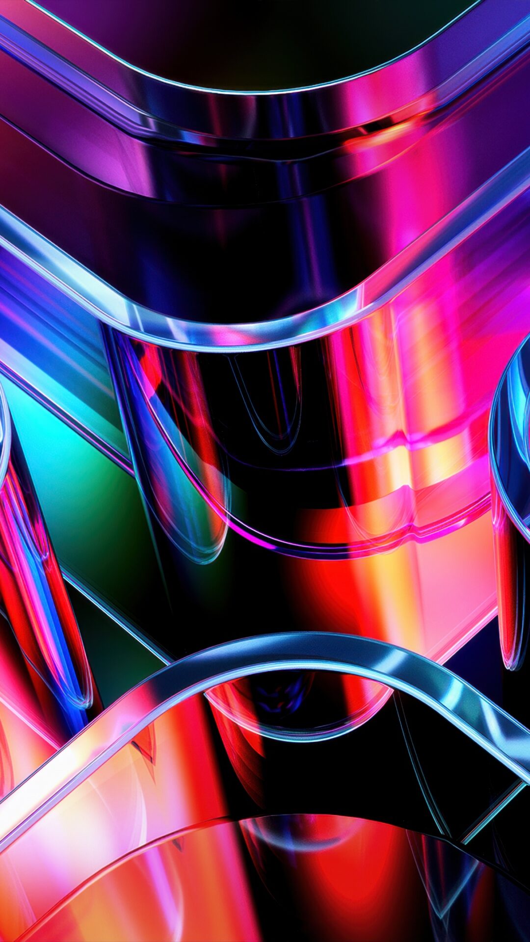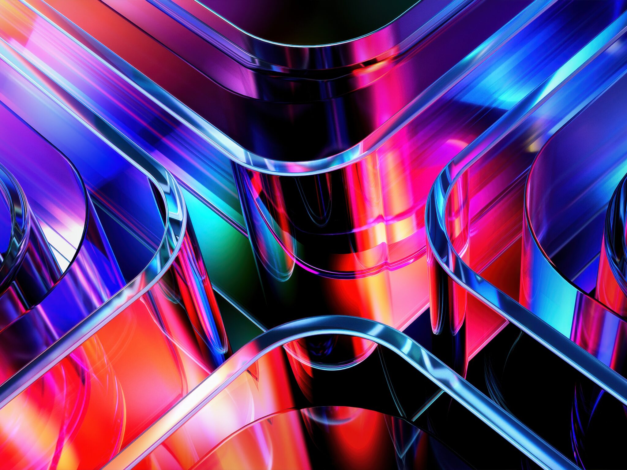 Glossy curved ribbons weave through each other with that sleek 3D render look, catching deep blues, hot pinks, and fiery orange-red tones against a dark background. For 4K monitors, this abstract piece brings some serious futuristic vibes to your desktop.