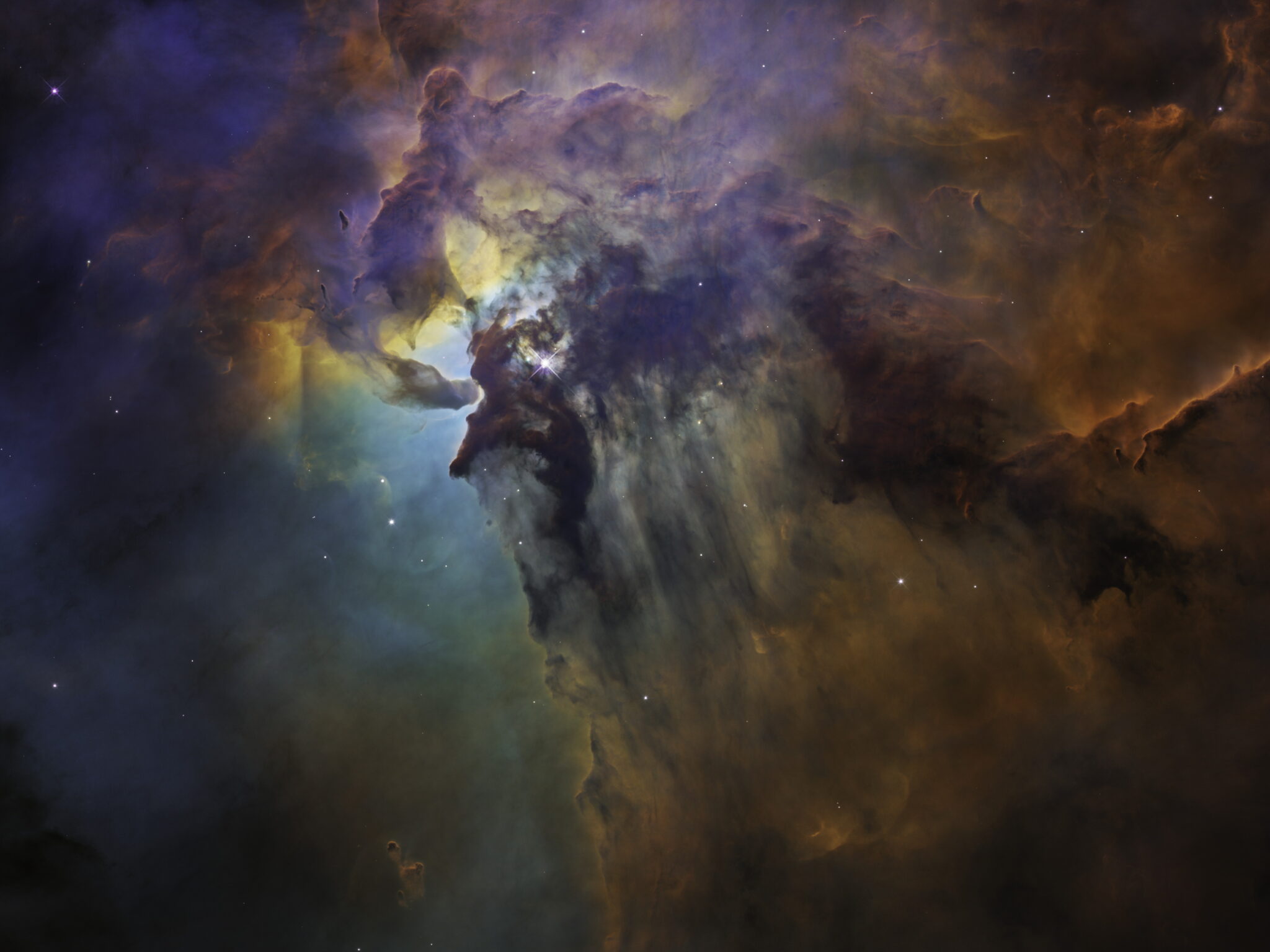 Clouds of indigo, plum, and burnt orange billow outward from a glowing turquoise center, with stars scattered throughout like frozen sparks. Ancient and turbulent — like watching a star being born from thousands of light-years away.