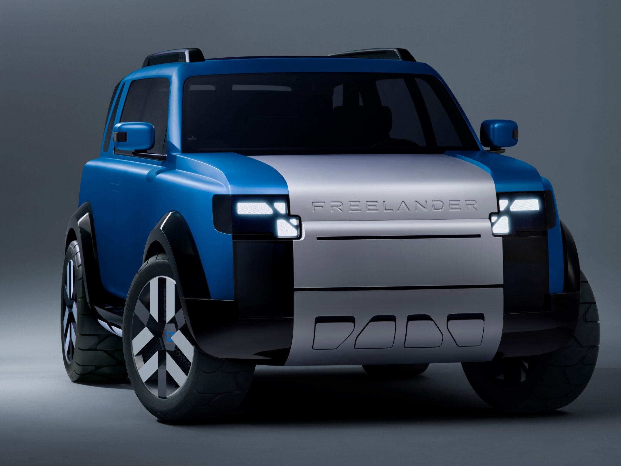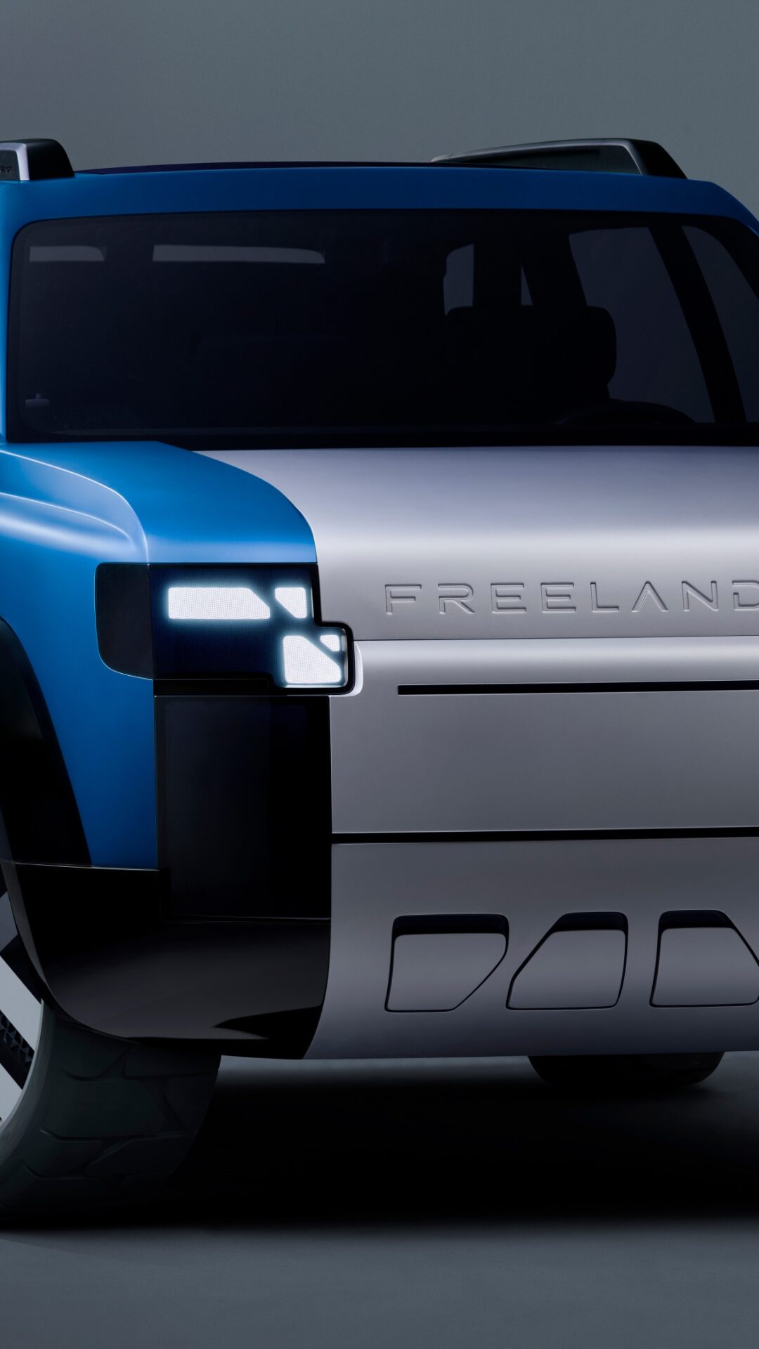 A blue Ineos Grenadier is centered against a gray gradient backdrop. The vehicle’s boxy form is highlighted by bright, rectangular headlight…
