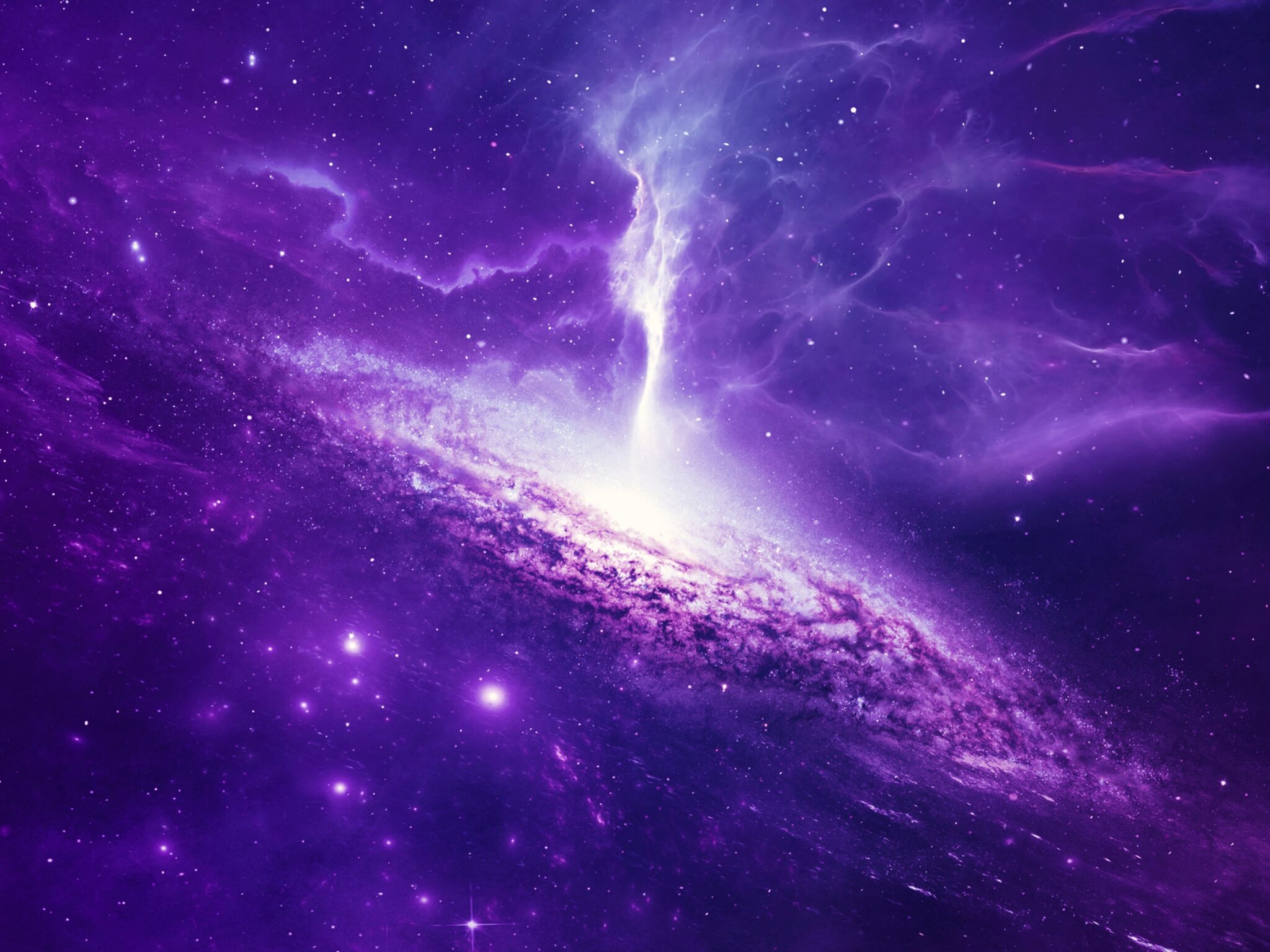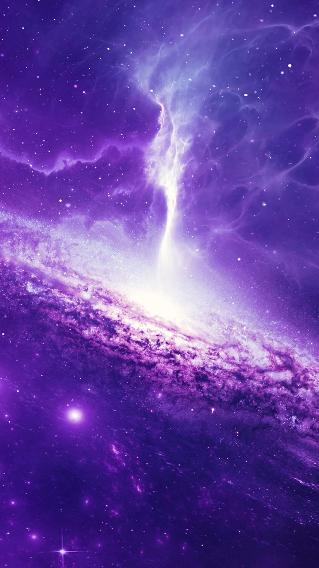 This cosmic scene displays a brilliant purple galaxy with swirling nebula clouds and a bright white energy beam shooting upward through deep violet space dotted with stars. Works beautifully for 4K desktop wallpapers when you want that dreamy space aesthetic.