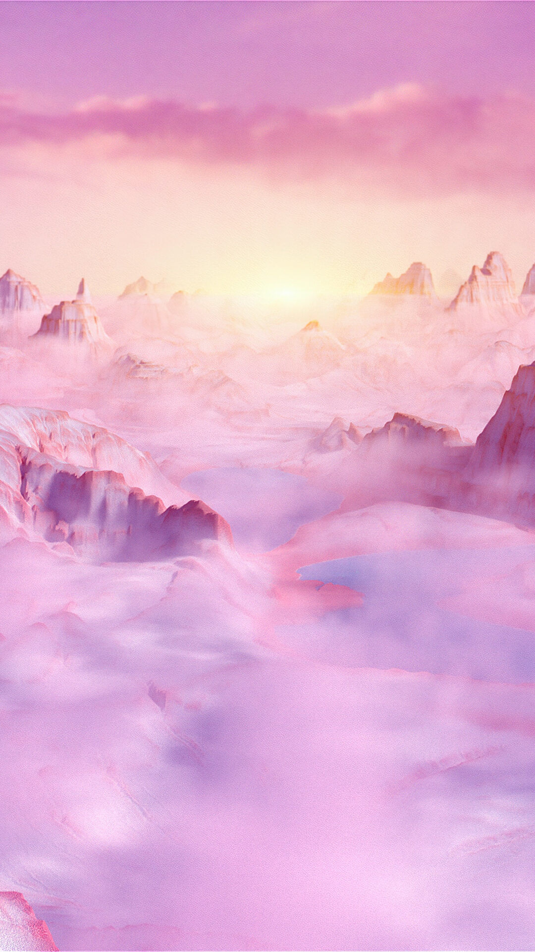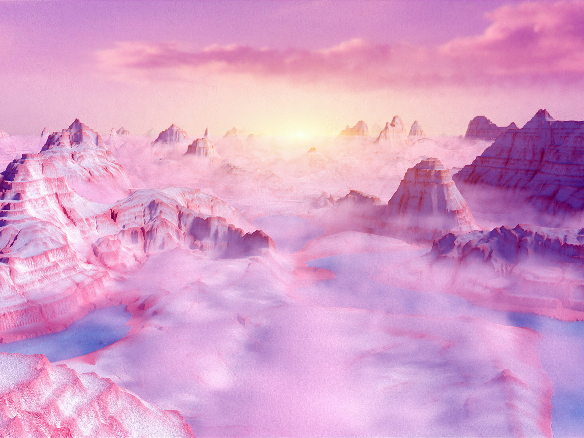 Dreamy pink and purple clouds drift through a surreal mountain landscape bathed in soft magenta and lavender hues. Works beautifully as a de
