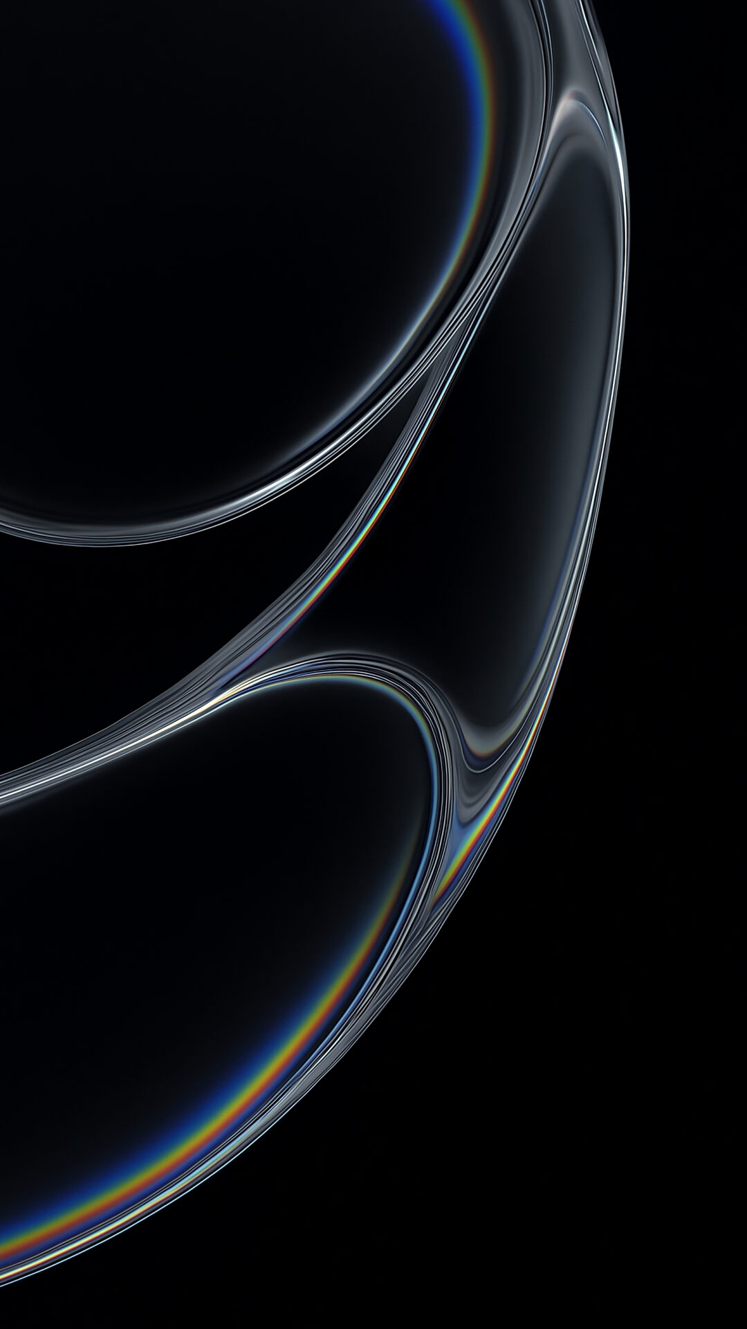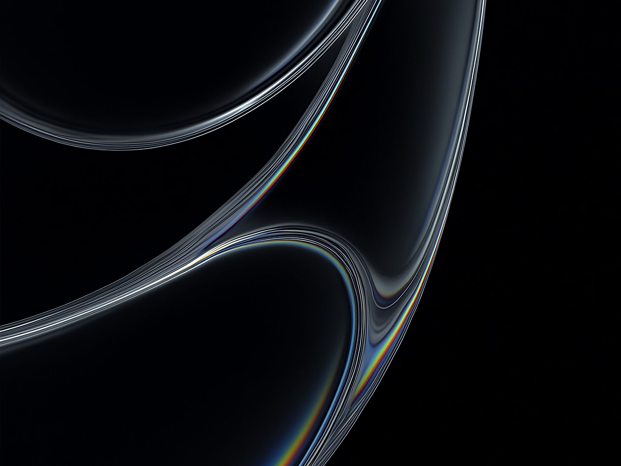 A close-up view presents a flowing abstract form against a solid black background. Light refracts through the smooth surfaces, creating a colorful iridescent sheen along the edges.