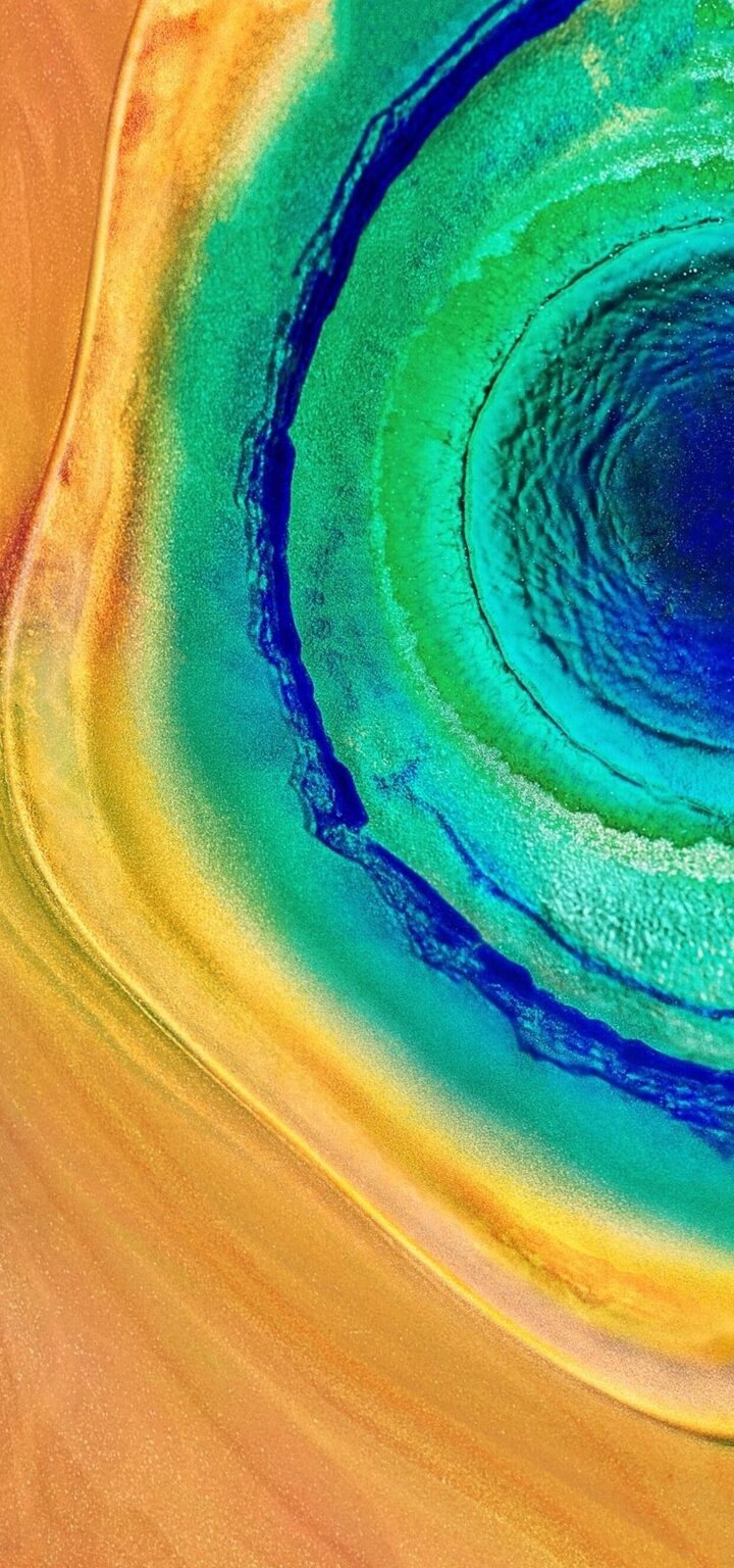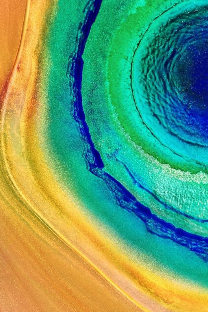 Concentric rings of teal, blue, and gold create an abstract circular composition. The smooth gradients and reflections give the surface a liquid, glossy texture.