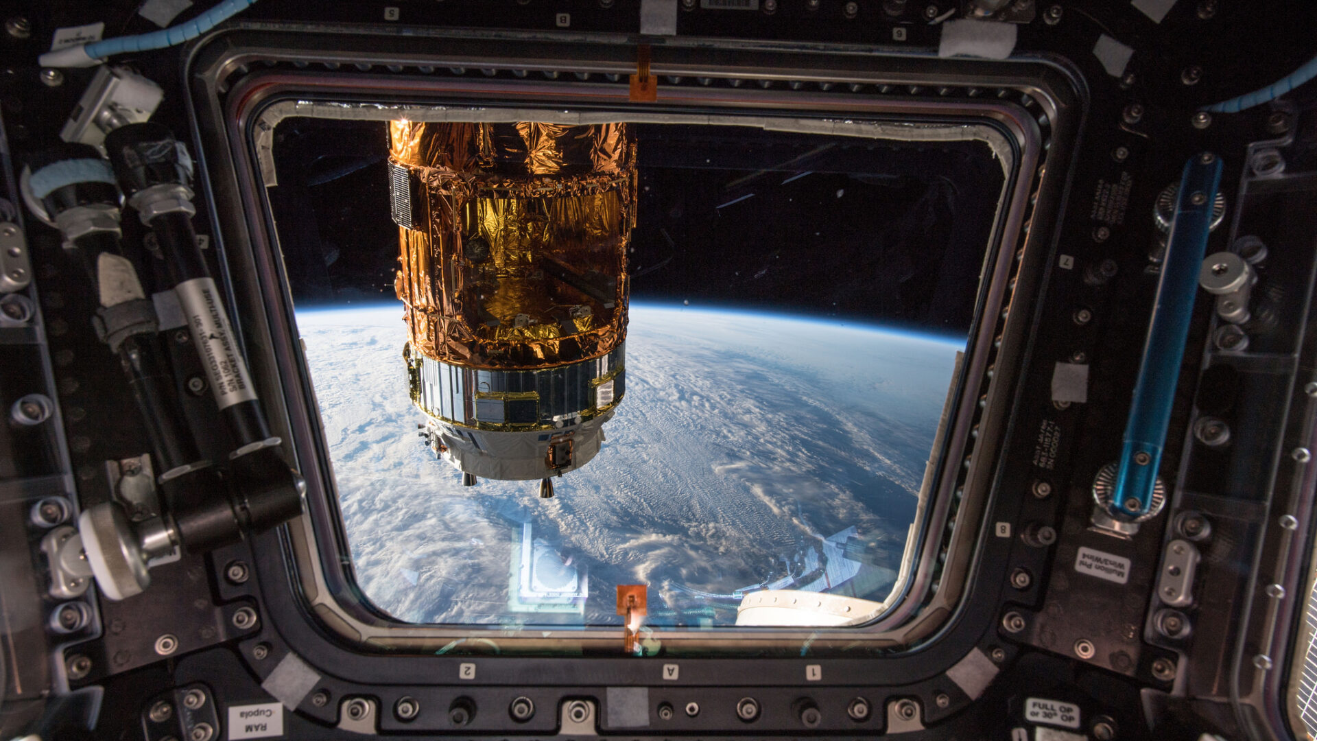 Looking out through a spacecraft's mechanical window frame, Earth fills the view in blue and white with a cylindrical instrument suspended i…
